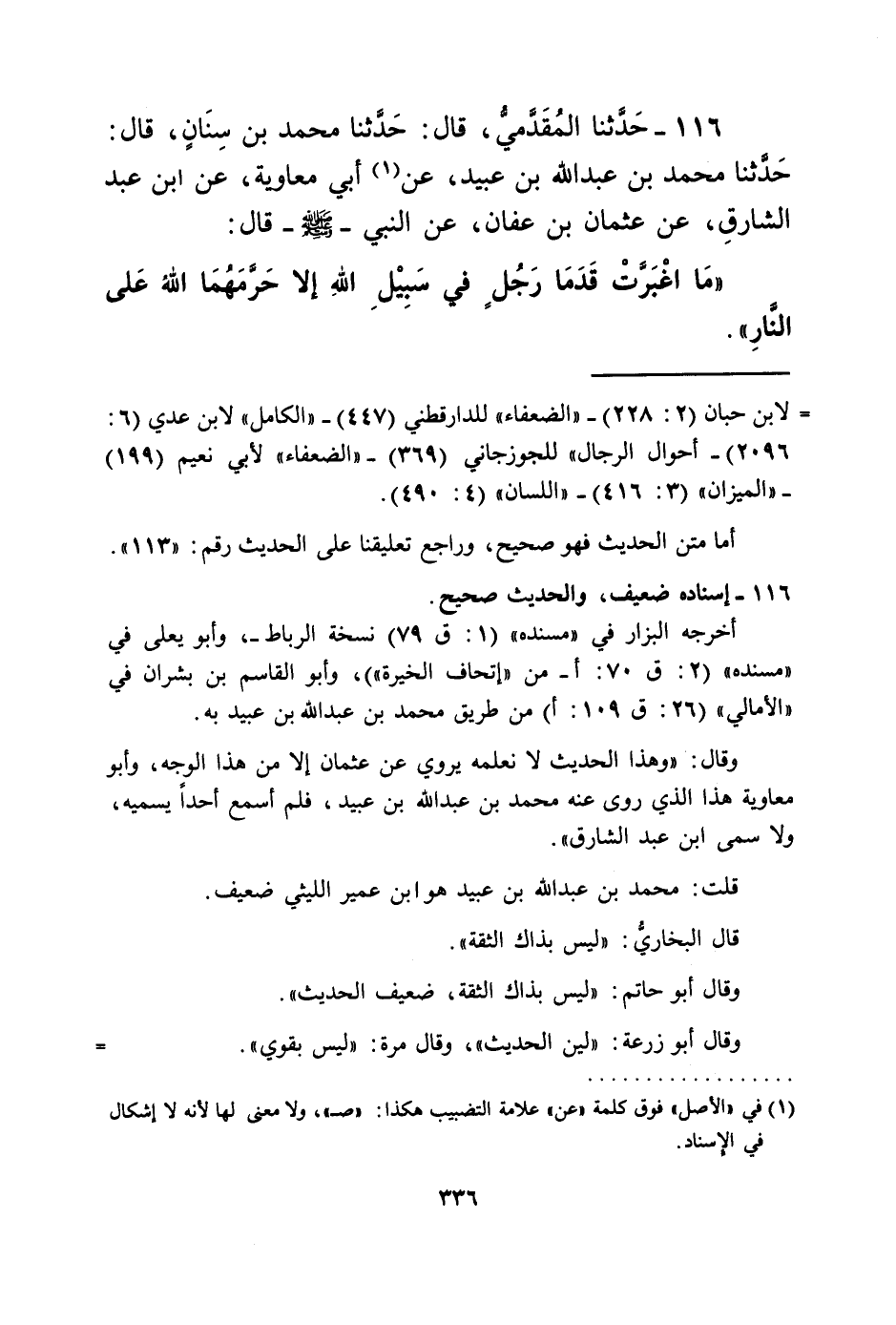 116 - حَدَّثَنَا الْمُقَدَّمِيُّ، قَالَ: حَدَّثَنَا مُحَمَّدُ بْنُ سِنَانٍ، قَالَ: حَدَّثَنَا مُحَمَّدُ بْنُ عَبْدِ اللَّهِ بْنِ عُبَيْدٍ، عَنْ أَبِي مُعَاوِيَةَ، عَنِ ابْنِ عَبْدِ الشَّارِقِ، عَنْ عُثْمَانَ بْنِ عَفَّانَ، عَنِ النَّبِيِّ صَلَّى اللهُ عَلَيْهِ وَسَلَّمَ قَالَ: «§مَا اغْبَرَّتْ قَدَمَا رَجُلٍ فِي سَبِيلِ اللَّهِ إِلَّا حَرَّمَهُمَا اللَّهُ عَلَى النَّارِ»