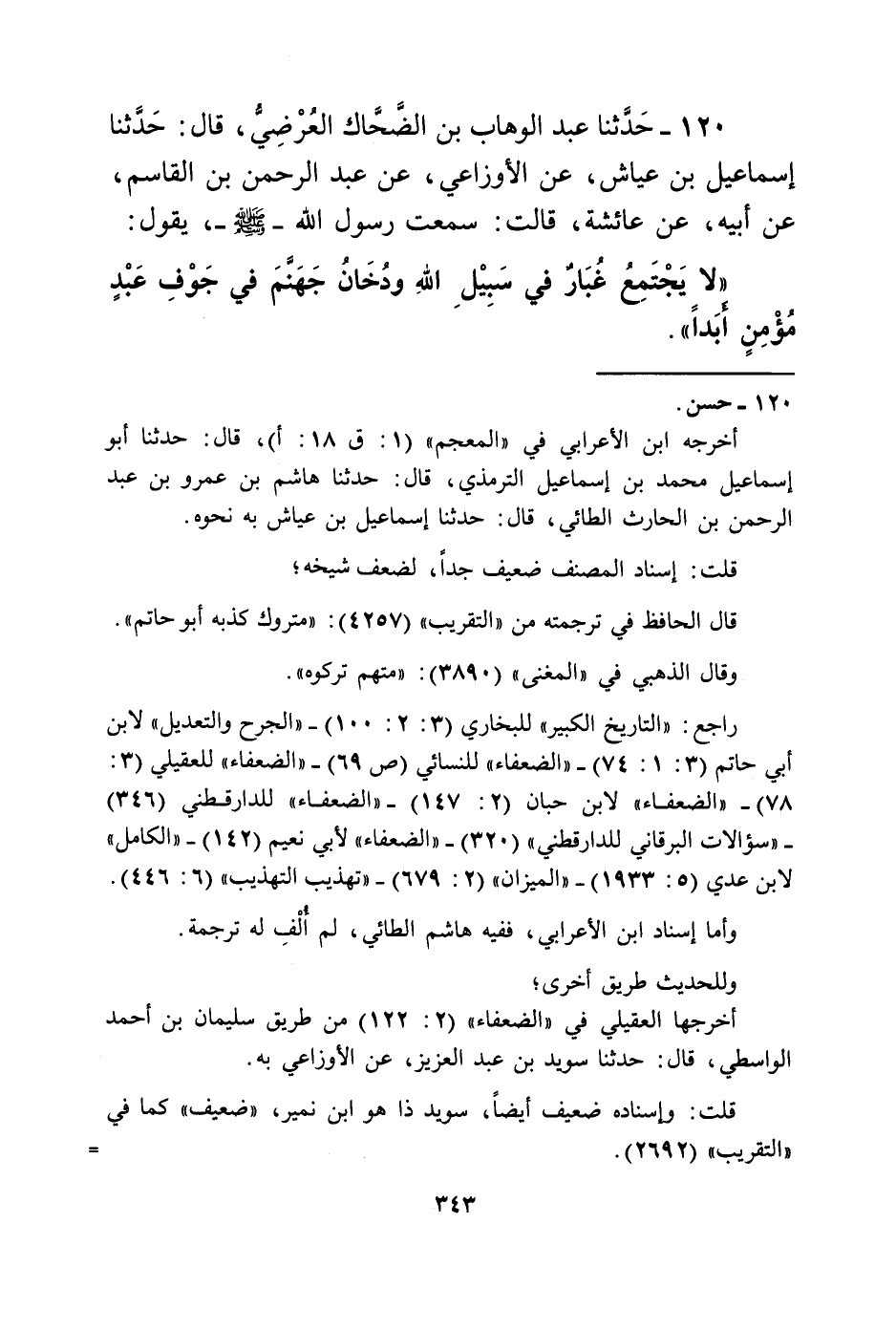 120 - حَدَّثَنَا عَبْدُ الْوَهَّابِ بْنُ الضَّحَّاكِ الْعُرْضِيُّ، قَالَ: حَدَّثَنَا إِسْمَاعِيلُ بْنُ عَيَّاشٍ، عَنِ الْأَوْزَاعِيِّ، عَنْ عَبْدِ الرَّحْمَنِ بْنِ الْقَاسِمِ، عَنْ أَبِيهِ، عَنْ عَائِشَةَ قَالَتْ: سَمِعْتُ رَسُولَ اللَّهِ صَلَّى اللهُ عَلَيْهِ وَسَلَّمَ يَقُولُ: «§لَا يَجْتَمِعُ غُبَارٌ فِي سَبِيلِ اللَّهِ، وَدُخَانُ جَهَنَّمَ فِي جَوْفِ عَبْدٍ مُؤْمِنٍ أَبَدًا»