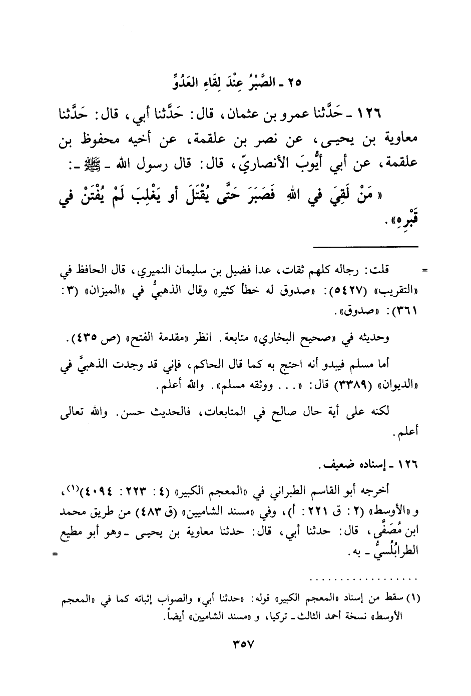 126 - حَدَّثَنَا عَمْرُو بْنُ عُثْمَانَ، قَالَ: حَدَّثَنَا أَبِي قَالَ: حَدَّثَنَا مُعَاوِيَةُ بْنُ يَحْيَى، عَنْ نَصْرِ بْنِ عَلْقَمَةَ، عَنْ أَخِيهِ مَحْفُوظِ بْنِ عَلْقَمَةَ، عَنْ أَبِي أَيُّوبَ الْأَنْصَارِيِّ قَالَ: قَالَ رَسُولُ اللَّهِ صَلَّى اللهُ عَلَيْهِ وَسَلَّمَ: «§مَنْ لَقِيَ فِي اللَّهِ فَصَبَرَ حَتَّى يُقْتَلَ، أَوْ يَغْلِبَ لَمْ يُفْتَنْ فِي قَبْرِهِ»