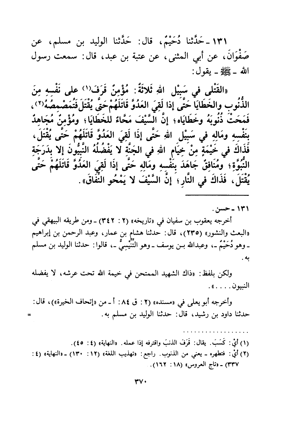 131 - حَدَّثَنَا دُحَيْمٌ، قَالَ: حَدَّثَنَا الْوَلِيدُ بْنُ مُسْلِمٍ، عَنْ صَفْوَانَ، عَنْ أَبِي الْمُثَنَّى، عَنْ عُتْبَةَ بْنِ عَبْدٍ قَالَ: سَمِعْتُ رَسُولَ اللَّهِ صَلَّى اللهُ عَلَيْهِ وَسَلَّمَ يَقُولُ: " §الْقَتْلَى فِي سَبِيلِ اللَّهِ ثَلَاثَةٌ: مُؤْمِنٌ قَرَفَ عَلَى نَفْسِهِ مِنَ الذُّنُوبِ وَالْخَطَايَا حَتَّى إِذَا لَقِيَ الْعَدُوَّ قَاتَلَهُمْ حَتَّى يُقْتَلَ، فَتُمَصْمِصُهُ فَمَحَتْ ذُنُوبَهُ وَخَطَايَاهُ، إِنَّ السَّيْفَ مَحَّاءٌ لِلْخَطَايَا، وَمُؤْمِنٌ مُجَاهِدٌ بِنَفْسِهِ وَمَالِهِ فِي سَبِيلِ اللَّهِ حَتَّى إِذَا لَقِيَ الْعَدُوَّ قَاتَلَهُمْ حَتَّى يُقْتَلَ، فَذَاكَ فِي خَيْمَةٍ مِنْ خِيَامِ اللَّهِ فِي الْجَنَّةِ، لَا يَفْضُلُهُ النَّبِيُّونَ إِلَّا بِدَرَجَةِ النُّبُوَّةِ، وَمُنَافِقٌ جَاهَدَ بِنَفْسِهِ وَمَالِهِ حَتَّى إِذَا لَقِيَ الْعَدُوَّ قَاتَلَهُمْ حَتَّى يُقْتَلَ، فَذَاكَ فِي النَّارِ، إِنَّ السَّيْفَ لَا يَمْحُو النِّفَاقَ "