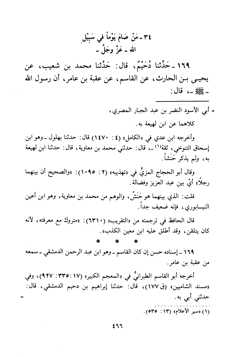 169 - حَدَّثَنَا دُحَيْمٌ، قَالَ: حَدَّثَنَا مُحَمَّدُ بْنُ شُعَيْبٍ، عَنْ يَحْيَى بْنِ الْحَارِثِ، عَنِ الْقَاسِمِ، عَنْ عُقْبَةَ بْنِ عَامِرٍ، أَنَّ رَسُولَ اللَّهِ صَلَّى اللهُ عَلَيْهِ وَسَلَّمَ قَالَ: «§مَنْ صَامَ يَوْمًا فِي سَبِيلِ اللَّهِ بَاعَدَ اللَّهُ مِنْهُ جَهَنَّمَ مَسِيرَةَ مِائَةِ عَامٍ»