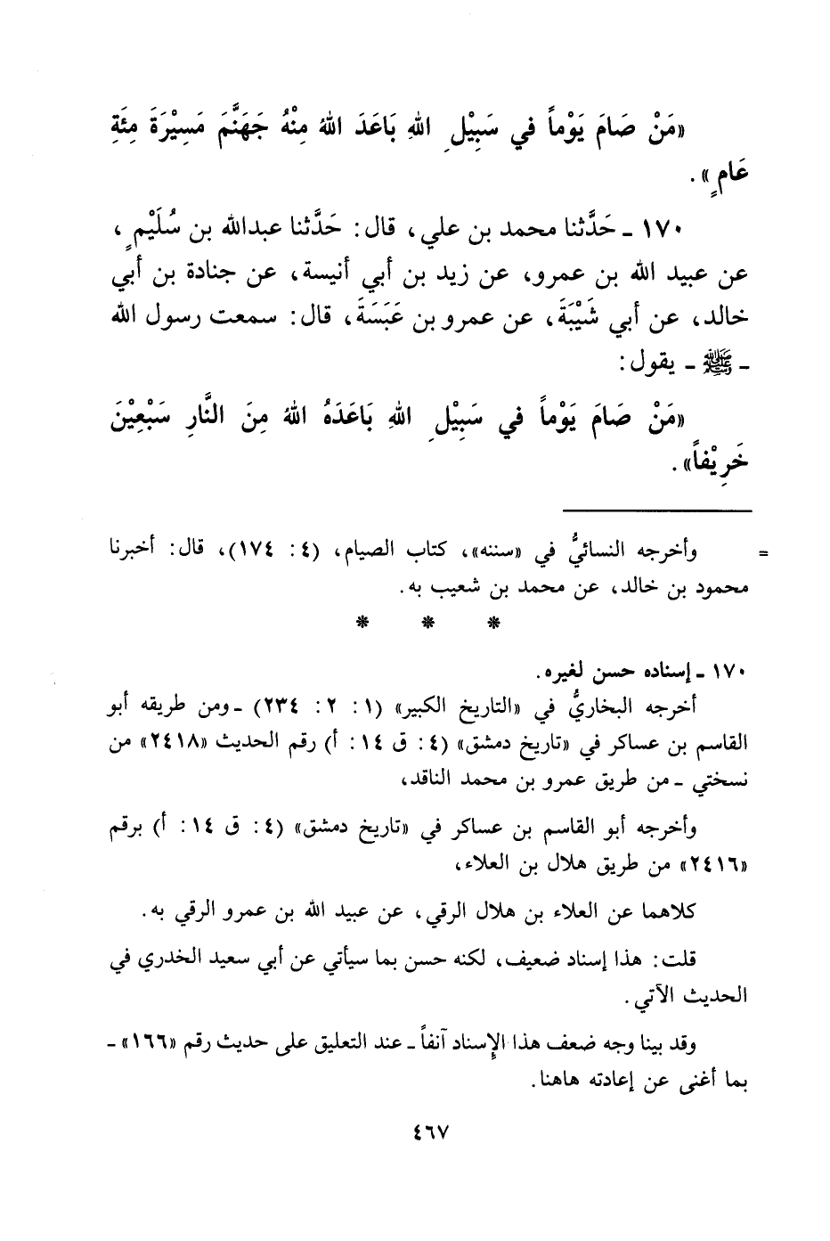 170 - حَدَّثَنَا مُحَمَّدُ بْنُ عَلِيٍّ، قَالَ: حَدَّثَنَا عَبْدُ اللَّهِ بْنُ سُلَيْمٍ، عَنْ عُبَيْدِ اللَّهِ بْنِ عَمْرٍو، عَنْ زَيْدِ بْنِ أَبِي أُنَيْسَةَ، عَنْ جُنَادَةَ بْنِ أَبِي خَالِدِ، عَنْ أَبِي شَيْبَةَ، عَنْ عَمْرِو بْنِ عَبَسَةَ قَالَ: سَمِعْتُ رَسُولَ اللَّهِ صَلَّى اللهُ عَلَيْهِ وَسَلَّمَ يَقُولُ: «§مَنْ صَامَ يَوْمًا فِي سَبِيلِ اللَّهِ بَاعَدَهُ اللَّهُ مِنَ النَّارِ سَبْعِينَ خَرِيفًا»