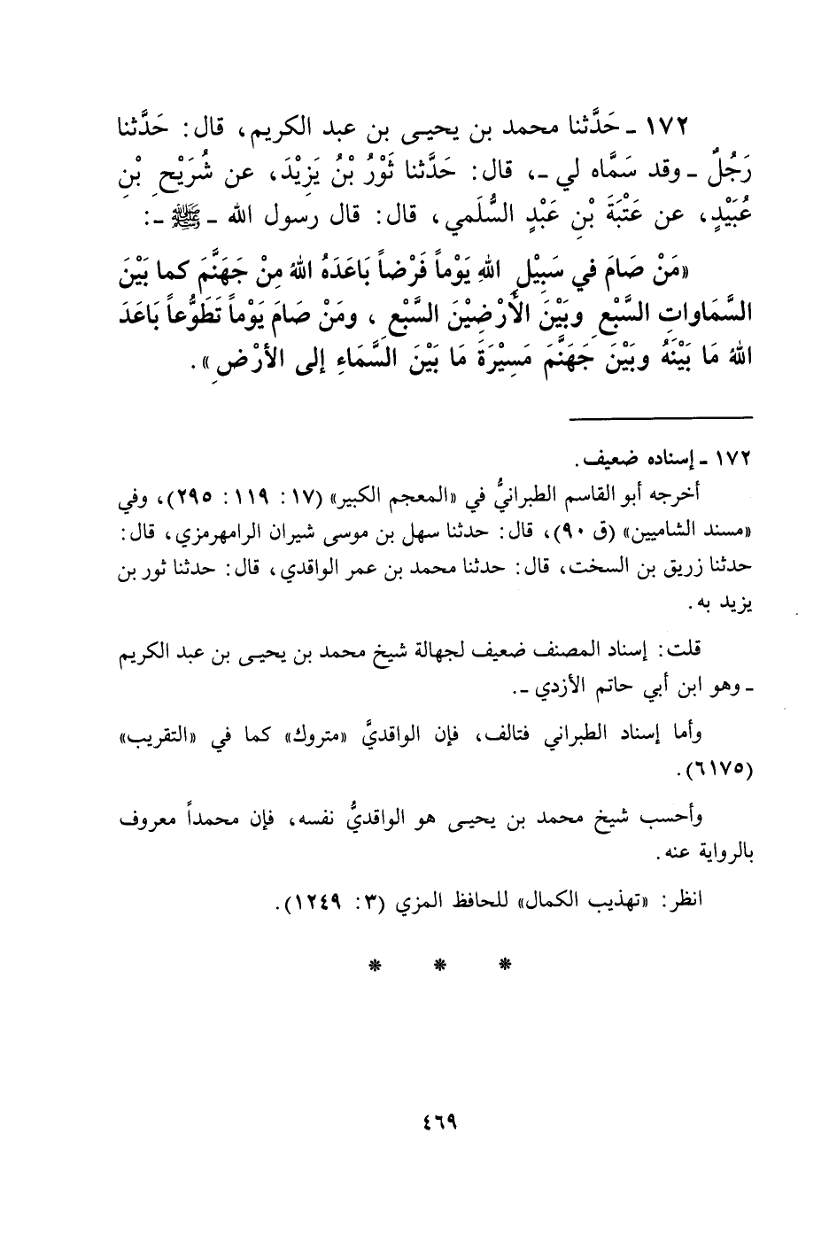 172 - حَدَّثَنَا مُحَمَّدُ بْنُ يَحْيَى بْنِ عَبْدِ الْكَرِيمِ، قَالَ: حَدَّثَنَا رَجُلٌ، وَقَدْ سَمَّاهُ لِي قَالَ حَدَّثَنَا ثَوْرُ بْنُ يَزِيدَ، عَنْ شُرَيْحِ بْنِ عُبَيْدٍ، عَنْ عُتْبَةَ بْنِ عَبْدٍ السُّلَمِيِّ قَالَ: قَالَ رَسُولُ اللَّهِ صَلَّى اللهُ عَلَيْهِ وَسَلَّمَ: «§مَنْ صَامَ فِي سَبِيلِ اللَّهِ يَوْمًا فَرْضًا بَاعَدَهُ اللَّهُ مِنْ جَهَنَّمَ، كَمَا بَيْنَ السَّمَاوَاتِ السَّبْعِ وَبَيْنَ الْأَرَضِينَ السَّبْعِ، وَمَنْ صَامَ يَوْمًا تَطَوُّعًا بَاعَدَ اللَّهُ مَا بَيْنَهُ وَبَيْنَ جَهَنَّمَ مَسِيرَةَ مَا بَيْنَ السَّمَاءِ إِلَى الْأَرْضِ»