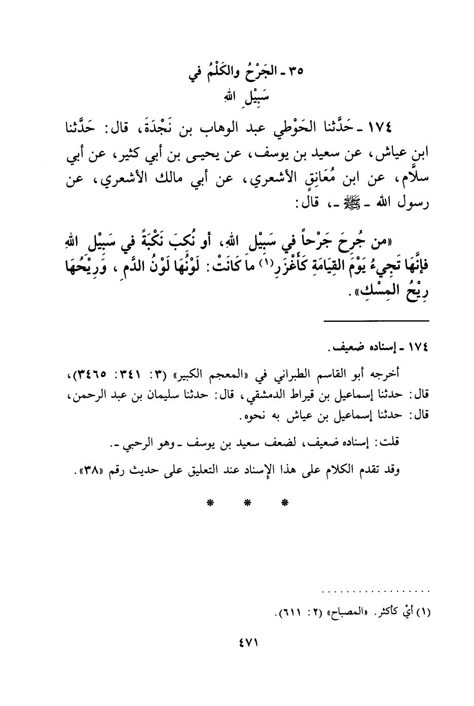 174 - حَدَّثَنَا الْحَوْطِيُّ عَبْدُ الْوَهَّابِ بْنُ نَجْدَةَ، قَالَ: حَدَّثَنَا ابْنُ عَيَّاشٍ، عَنْ سَعِيدِ بْنِ يُوسُفَ، عَنْ يَحْيَى بْنِ أَبِي كَثِيرٍ، عَنْ أَبِي سَلَّامٍ، عَنِ ابْنِ مُعَانِقٍ الْأَشْعَرِيِّ، عَنْ أَبِي مَالِكٍ الْأَشْعَرِيِّ، عَنْ رَسُولِ اللَّهِ صَلَّى اللهُ عَلَيْهِ وَسَلَّمَ قَالَ: " §مَنْ جُرِحَ جَرْحًا فِي سَبِيلِ اللَّهِ، أَوْ نُكِبَ نَكْبَةً فِي سَبِيلِ اللَّهِ، فَإِنَّهَا تَجِيءُ يَوْمَ الْقِيَامَةِ كَأَغْزَرِ مَا كَانَتْ: لَوْنُهَا لَوْنُ الدَّمِ، وَرِيحُهَا رِيحُ الْمِسْكِ "