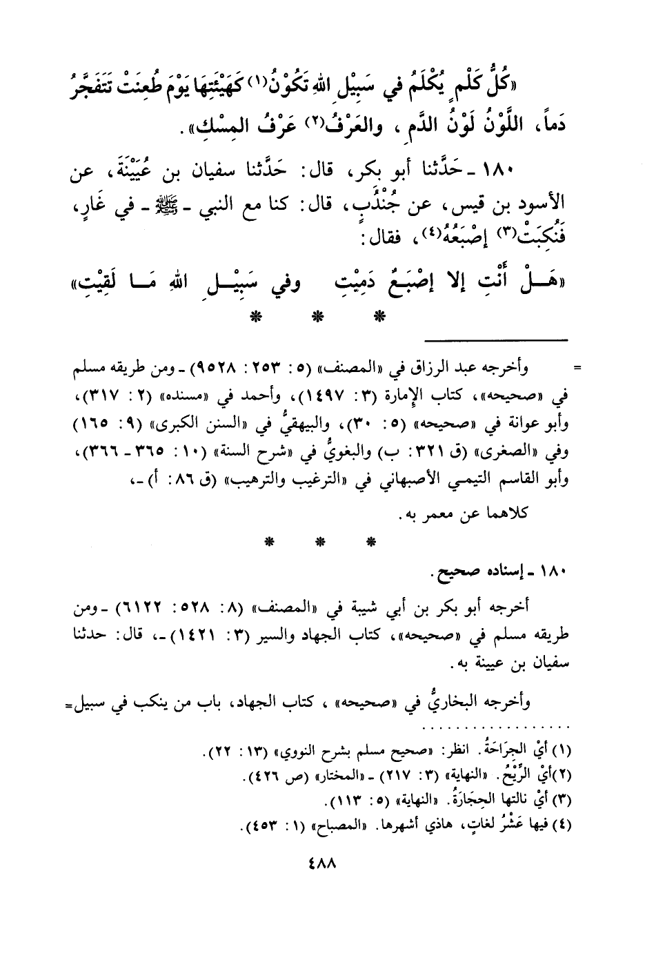180 - حَدَّثَنَا أَبُو بَكْرٍ، قَالَ: حَدَّثَنَا سُفْيَانُ بْنُ عُيَيْنَةَ، عَنِ الْأَسْوَدِ بْنِ قَيْسٍ، عَنْ جُنْدُبٍ، قَالَ: كُنَّا مَعَ النَّبِيِّ صَلَّى اللهُ عَلَيْهِ وَسَلَّمَ فِي غَارٍ، فَنُكِبَتْ إِصْبَعُهُ فَقَالَ: «§هَلْ أَنْتِ إِلَّا إِصْبَعٌ دَمِيتِ، وَفِي سَبِيلِ اللَّهِ مَا لَقِيتِ»