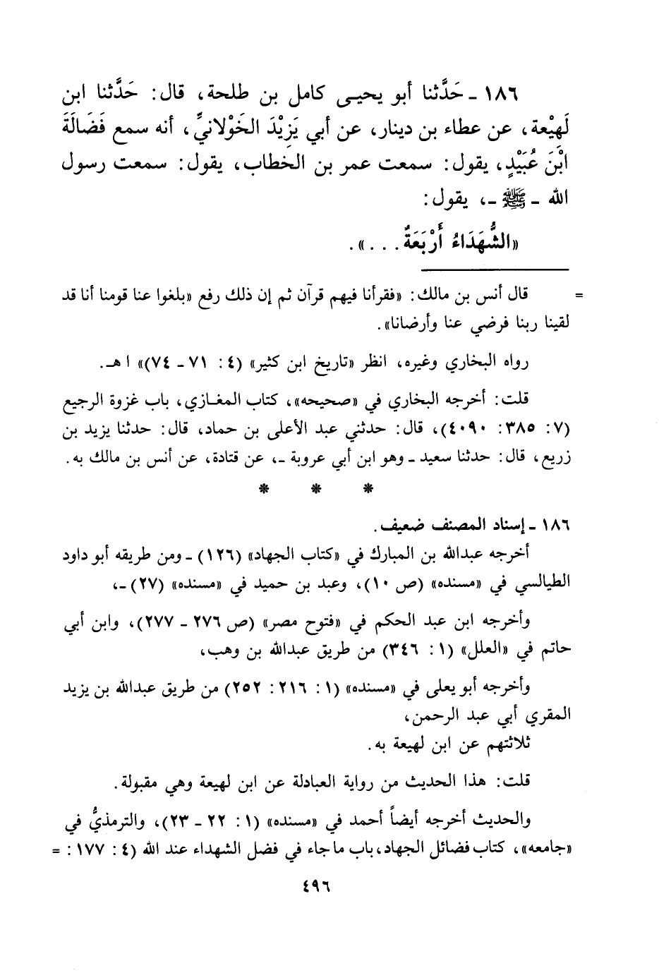 186 - حَدَّثَنَا أَبُو يَحْيَى كَامِلُ بْنُ طَلْحَةَ، قَالَ: حَدَّثَنَا ابْنُ لَهِيعَةَ، عَنْ عَطَاءِ بْنِ دِينَارٍ، عَنْ أَبِي يَزِيدَ الْخَوْلَانِيِّ، أَنَّهُ سَمِعَ فَضَالَةَ بْنَ عُبَيْدٍ، يَقُولُ: سَمِعْتُ عُمَرَ بْنَ الْخَطَّابِ يَقُولُ: سَمِعْتُ رَسُولَ اللَّهِ صَلَّى اللهُ عَلَيْهِ وَسَلَّمَ يَقُولُ: «§الشُّهَدَاءُ أَرْبَعَةٌ»