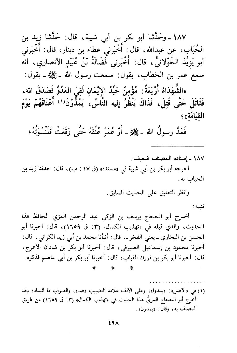 187 - وَحَدَّثَنَا أَبُو بَكْرِ بْنُ أَبِي شَيْبَةَ قَالَ: حَدَّثَنَا زَيْدُ بْنُ الْحُبَابِ، عَنْ عَبْدِ اللَّهِ، قَالَ: أَخْبَرَنِي عَطَاءُ بْنُ دِينَارٍ، قَالَ: أَخْبَرَنِي أَبُو يَزِيدَ الْخَوْلَانِيُّ، قَالَ: أَخْبَرَنِي فَضَالَةُ بْنُ عُبَيْدٍ الْأَنْصَارِيُّ، أَنَّهُ سَمِعَ عُمَرَ بْنَ الْخَطَّابِ يَقُولُ: سَمِعْتُ رَسُولَ اللَّهِ صَلَّى اللهُ عَلَيْهِ وَسَلَّمَ يَقُولُ: " §الشُّهَدَاءُ أَرْبَعَةٌ: مُؤْمِنٌ جَيِّدُ الْإِيمَانِ لَقِيَ الْعَدُوَّ فَصَدَقَ اللَّهَ، فَقَاتَلَ حَتَّى قُتِلَ، فَذَاكَ يَنْظُرُ إِلَيْهِ النَّاسُ، يَمُدُّونَ أَعْنَاقَهُمْ يَوْمَ الْقِيَامَةِ «، فَمَدَّ رَسُولُ اللَّهِ صَلَّى اللهُ عَلَيْهِ وَسَلَّمَ أَوْ عُمَرُ عُنُقَهُ حَتَّى وَقَعَتْ قَلَنْسُوَتُهُ -[499]-،» وَرَجُلٌ مُؤْمِنٌ خَلَطَ عَمَلًا صَالِحًا وَآخَرَ سَيِّئًا، لَقِيَ الْعَدُوَّ فَصَدَقَ، فَكَأَنَّمَا ضُرِبَ بِشَوْكِ الطَّلْحِ فَجَاءَ سَهْمٌ غَرْبٌ فَقَتَلَهُ، وَرَجُلٌ مُؤْمِنٌ لَقِيَ الْعَدُوَّ فَقَاتَلَ، فَصَدَقَ اللَّهَ فَقُتِلَ، فَذَاكَ فِي الدَّرَجَةِ الثَّالِثَةِ، وَرَجُلٌ مُؤْمِنٌ أَسْرَفَ عَلَى نَفْسِهِ، لَقِيَ الْعَدُوَّ فَصَدَقَ اللَّهَ، فَقَاتَلَ حَتَّى قُتِلَ، فَذَاكَ فِي الدَّرَجَةِ الرَّابِعَةِ "