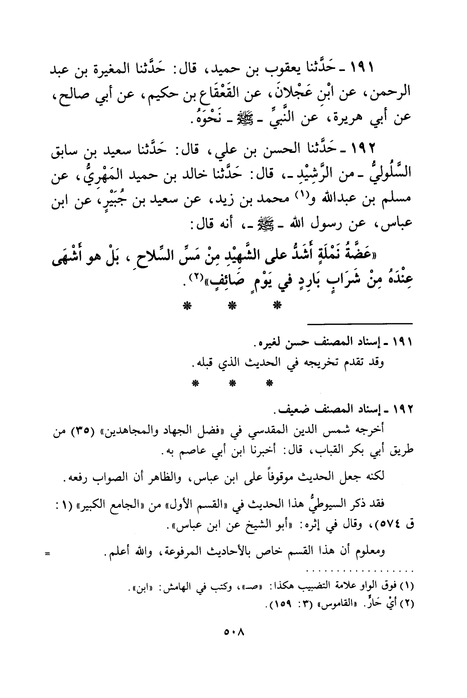 192 - حَدَّثَنَا الْحَسَنُ بْنُ عَلِيٍّ، قَالَ: حَدَّثَنَا سَعِيدُ بْنُ سَابِقٍ السَّلُولِيُّ مِنَ الرَّشِيدِ قَالَ: حَدَّثَنَا خَالِدُ بْنُ حُمَيْدٍ الْمَهْرِيُّ، عَنْ مُسْلِمِ بْنِ عَبْدِ اللَّهِ وَمُحَمَّدِ بْنِ زَيْدٍ، عَنْ سَعِيدِ بْنِ جُبَيْرٍ، عَنْ ابْنِ عَبَّاسٍ، عَنْ رَسُولِ اللَّهِ صَلَّى اللهُ عَلَيْهِ وَسَلَّمَ أَنَّهُ قَالَ: «§عَضَّةُ نَمْلَةٍ أَشَدُّ عَلَى الشَّهِيدِ مِنْ مَسِّ السِّلَاحِ، بَلْ هُوَ أَشْهَى عِنْدَهُ مِنْ شَرَابٍ بَارِدٍ فِي يَوْمٍ صَائِفٍ»