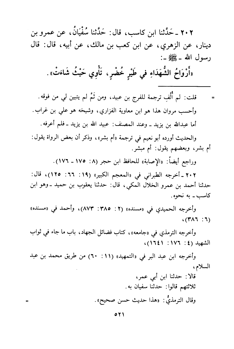 202 - حَدَّثَنَا ابْنُ كَاسِبٍ، قَالَ: حَدَّثَنَا سُفْيَانُ، عَنْ عَمْرِو بْنِ دِينَارٍ، عَنْ الزُّهْرِيِّ، عَنْ ابْنِ كَعْبِ بْنِ مَالِكٍ، عَنْ أَبِيهِ، قَالَ: قَالَ رَسُولُ اللَّهِ صَلَّى اللهُ عَلَيْهِ وَسَلَّمَ: «§أَرْوَاحُ الشُّهَدَاءِ فِي طَيْرٍ خُضْرٍ، تَأْوِي حَيْثُ شَاءَتْ»