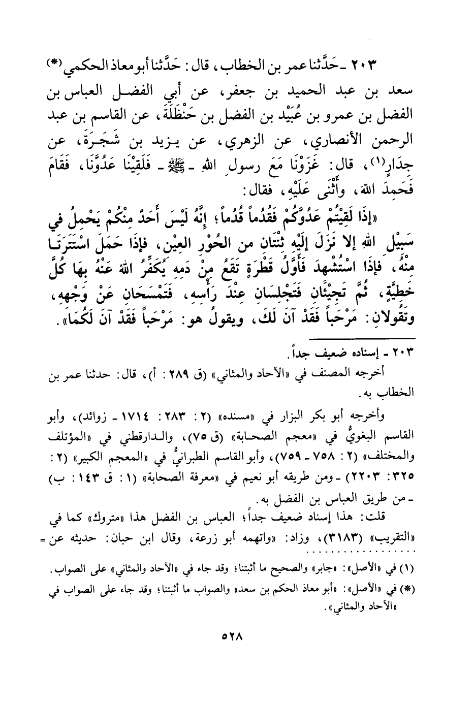 203 - حَدَّثَنَا عُمَرُ بْنُ الْخَطَّابِ، قَالَ: حَدَّثَنَا أَبُو مُعَاذٍ الْحَكَمِيُّ سَعْدُ بْنُ عَبْدِ الْحَمِيدِ بْنِ جَعْفَرٍ، عَنْ أَبِي الْفَضْلِ الْعَبَّاسِ بْنِ الْفَضْلِ بْنِ عَمْرِو بْنِ عُبَيْدِ بْنِ الْفَضْلِ بْنِ حَنْظَلَةَ، عَنِ الْقَاسِمِ بْنِ عَبْدِ الرَّحْمَنِ الْأَنْصَارِيِّ، عَنِ الزُّهْرِيِّ، عَنْ يَزِيدَ بْنِ شَجَرَةَ، عَنْ جِدَارٍ قَالَ: غَزَوْنَا مَعَ رَسُولِ اللَّهِ صَلَّى اللهُ عَلَيْهِ وَسَلَّمَ فَلَقِينَا عَدُوَّنَا، فَقَامَ فَحَمِدَ اللَّهَ، وَأَثْنَى عَلَيْهِ، فَقَالَ: " §إِذَا لَقِيتُمْ عَدُوَّكُمْ فَقُدُمًا قُدُمًا، إِنَّهُ لَيْسَ أَحَدٌ مِنْكُمْ يَحْمِلُ فِي سَبِيلِ اللَّهِ إِلَّا نَزَلَ إِلَيْهِ ثِنْتَانِ مِنَ الْحُورِ الْعِينِ، فَإِذَا حَمَلَ اسْتَتَرَتَا مِنْهُ، فَإِذَا اسْتُشْهِدَ فَأَوَّلُ قَطْرَةٍ تَقَعُ مِنْ دَمِهِ يُكَفِّرُ اللَّهُ عَنْهُ بِهَا كُلَّ خَطِيَّةٍ، ثُمَّ تَجِيئَانِ فَتَجْلِسَانِ عِنْدَ رَأْسِهِ، فَتَمْسَحَانِ عَنْ وَجْهِهِ، وَتَقُولَانِ: مَرْحَبًا فَقَدْ آنَ لَكَ، وَيَقُولُ هُوَ: مَرْحَبًا فَقَدْ آنَ لَكُمَا "