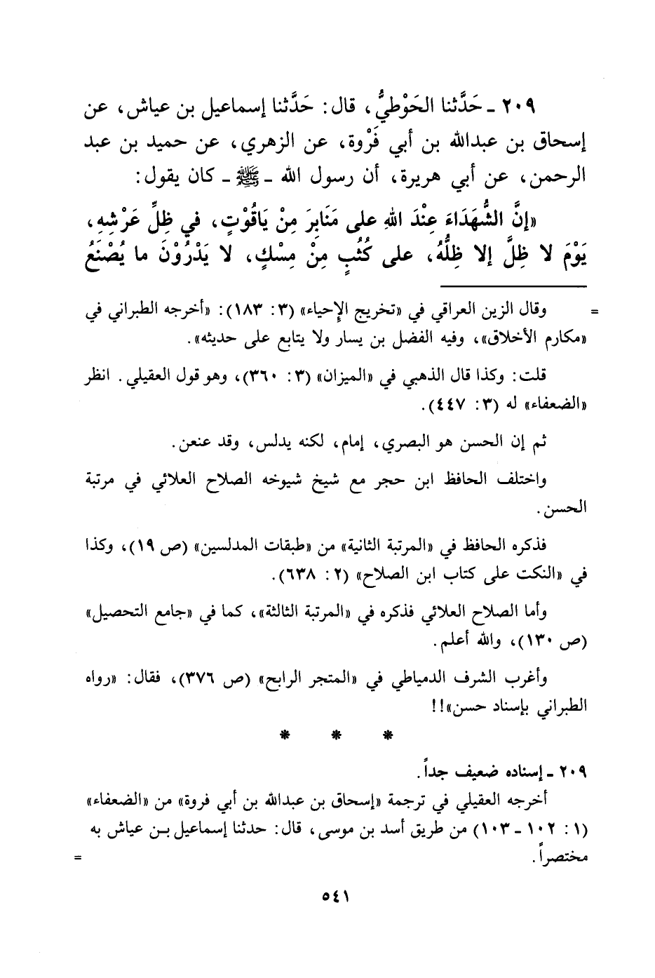 209 - حَدَّثَنَا الْحَوْطِيُّ، قَالَ: حَدَّثَنَا إِسْمَاعِيلُ بْنُ عَيَّاشٍ، عَنْ إِسْحَاقَ بْنِ عَبْدِ اللَّهِ بْنِ أَبِي فَرْوَةَ، عَنِ الزُّهْرِيِّ، عَنْ حُمَيْدِ بْنِ عَبْدِ الرَّحْمَنِ، عَنْ أَبِي هُرَيْرَةَ، أَنَّ رَسُولَ اللَّهِ صَلَّى اللهُ عَلَيْهِ وَسَلَّمَ كَانَ يَقُولُ: " إِنَّ الشُّهَدَاءَ عِنْدَ اللَّهِ عَلَى مَنَابِرَ مِنْ يَاقُوتٍ، فِي ظِلِّ عَرْشِهِ، يَوْمَ لَا ظِلَّ إِلَّا ظِلُّهُ، عَلَى كُثُبٍ مِنْ مِسْكٍ، لَا يَدْرُونَ مَا يُصْنَعُ -[542]- بِالنَّاسِ، فَيَقُولُ بَعْضُهُمْ لِبَعْضٍ: أَلَا نَنْطَلِقُ إِلَى النَّاسِ فَنَنْظُرُ مَا يُصْنَعُ بِهِمْ؟ فَيَمْشُونَ حَتَّى يَنْظُرُوا إِلَى النَّاسِ ثُمَّ يَرْجِعُونَ فَيَجْلِسُونَ، فَيَقُولُ لَهُمُ الرَّبُّ: §أَلَمْ أُوَفِّ لَكُمْ وَأَصْدُقْكُمْ؟ فَيَقُولُونَ: بَلَى رَبَّنَا لَوْ صَنَعْتَ بِنَا وَاحِدَةً، قَالَ: مَا هِيَ؟ قَالُوا: لَوْ رَدَدْتَنَا إِلَى الدُّنْيَا حَتَّى نُقْتَلَ فِيكَ الثَّانِيَةَ "