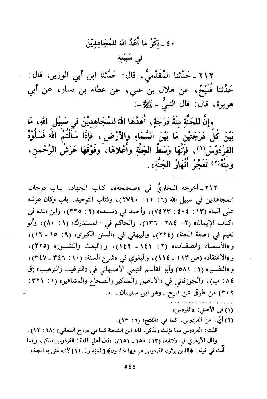 212 - حَدَّثَنَا الْمُقَدَّمِيُّ، قَالَ: حَدَّثَنَا ابْنُ أَبِي الْوَزِيرِ، قَالَ: حَدَّثَنَا فُلَيْحٌ، عَنْ هِلَالِ بْنِ عَلِيٍّ، عَنْ عَطَاءِ بْنِ يَسَارٍ، عَنْ أَبِي هُرَيْرَةَ قَالَ: قَالَ النَّبِيُّ صَلَّى اللهُ عَلَيْهِ وَسَلَّمَ: «إِنَّ §لِلْجَنَّةِ مِئَةَ دَرَجَةٍ، أَعَدَّهَا اللَّهُ لِلْمُجَاهِدِينَ فِي سَبِيلِ اللَّهِ، مَا بَيْنَ كُلِّ دَرَجَتَيْنِ مَا بَيْنَ السَّمَاءِ وَالْأَرْضِ، فَإِذَا سَأَلْتُمُ اللَّهَ فَسَلُوهُ الْفِرْدَوْسَ، فَإِنَّهَا وَسَطُ الْجَنَّةِ وَأَعْلَاهَا وَفَوْقَهَا عَرْشُ الرَّحْمَنِ، وَمِنْهُ تَفَجَّرُ أَنْهَارُ الْجَنَّةِ»