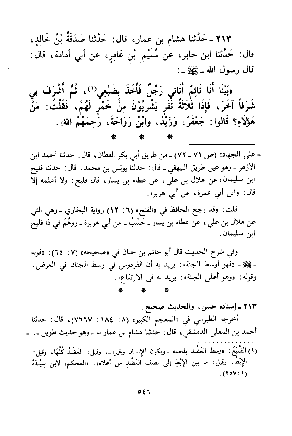 213 - حَدَّثَنَا هِشَامُ بْنُ عَمَّارٍ، قَالَ: حَدَّثَنَا صَدَقَةُ بْنُ خَالِدٍ، قَالَ: حَدَّثَنَا ابْنُ جَابِرٍ، عَنْ سُلَيْمِ بْنِ عَامِرٍ، عَنْ أَبِي أُمَامَةَ قَالَ: قَالَ رَسُولُ اللَّهِ صَلَّى اللهُ عَلَيْهِ وَسَلَّمَ: " §بَيْنَا أَنَا نَائِمٌ أَتَانِي رَجُلٌ فَأَخَذَ بِضَبْعِي، ثُمَّ أَشْرَفَ بِي شَرَفًا آخَرَ، فَإِذَا ثَلَاثَةُ نَفَرٍ يَشْرَبُونَ مِنْ خَمْرٍ لَهُمْ، فَقُلْتُ: مَنْ هَؤُلَاءِ؟ قَالُوا: جَعْفَرٌ، وَزَيْدٌ، وَابْنُ رَوَاحَةَ رَحِمَهُمُ اللَّهُ "