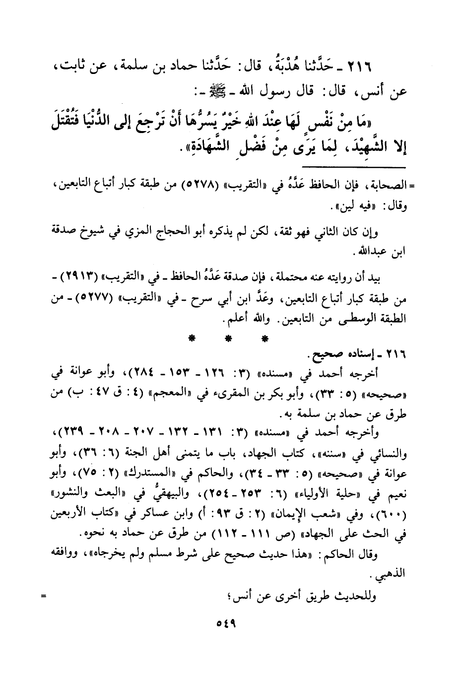 216 - حَدَّثَنَا هُدْبَةُ، قَالَ: حَدَّثَنَا حَمَّادُ بْنُ سَلَمَةَ، عَنْ ثَابِتٍ، عَنْ أَنَسٍ قَالَ: قَالَ رَسُولُ اللَّهِ صَلَّى اللهُ عَلَيْهِ وَسَلَّمَ: «§مَا مِنْ نَفْسٍ لَهَا عِنْدَ اللَّهِ خَيْرٌ يَسُرُّهَا أَنْ تَرْجِعَ إِلَى الدُّنْيَا فَتُقْتَلَ إِلَّا الشَّهِيدَ، لِمَا يَرَى مِنْ فَضْلِ الشَّهَادَةِ»