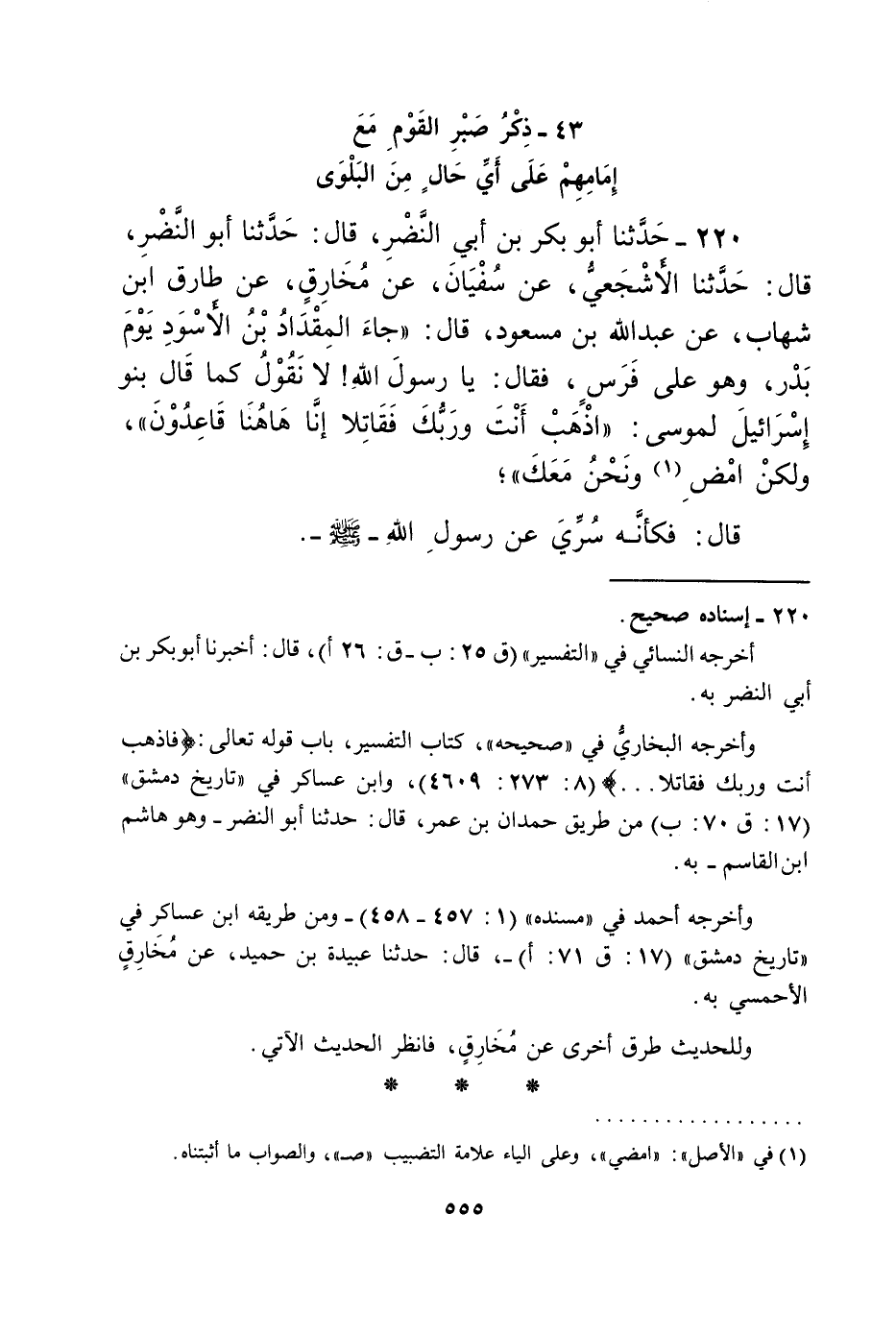 220 - حَدَّثَنَا أَبُو بَكْرِ بْنُ أَبِي النَّضْرِ، قَالَ: حَدَّثَنَا أَبُو النَّضْرِ، قَالَ: حَدَّثَنَا الْأَشْجَعِيُّ، عَنْ سُفْيَانَ، عَنْ مُخَارِقٍ، عَنْ طَارِقِ بْنِ شِهَابٍ، عَنْ عَبْدِ اللَّهِ بْنِ مَسْعُودٍ قَالَ: جَاءَ الْمِقْدَادُ بْنُ الْأَسْوَدِ يَوْمَ بَدْرٍ وَهُوَ عَلَى فَرَسٍ فَقَالَ: يَا رَسُولَ اللَّهِ، §لَا نَقُولُ كَمَا قَالَ بَنُو إِسْرَائِيلَ لِمُوسَى: {اذْهَبْ أَنْتَ وَرَبُّكَ فَقَاتِلَا إِنَّا هَاهُنَا قَاعِدُونَ} ، وَلَكِنِ امْضِ وَنَحْنُ مَعَكَ. قَالَ: «فَكَأَنَّهُ سُرِّيَ عَنْ رَسُولِ اللَّهِ صَلَّى اللهُ عَلَيْهِ وَسَلَّمَ»