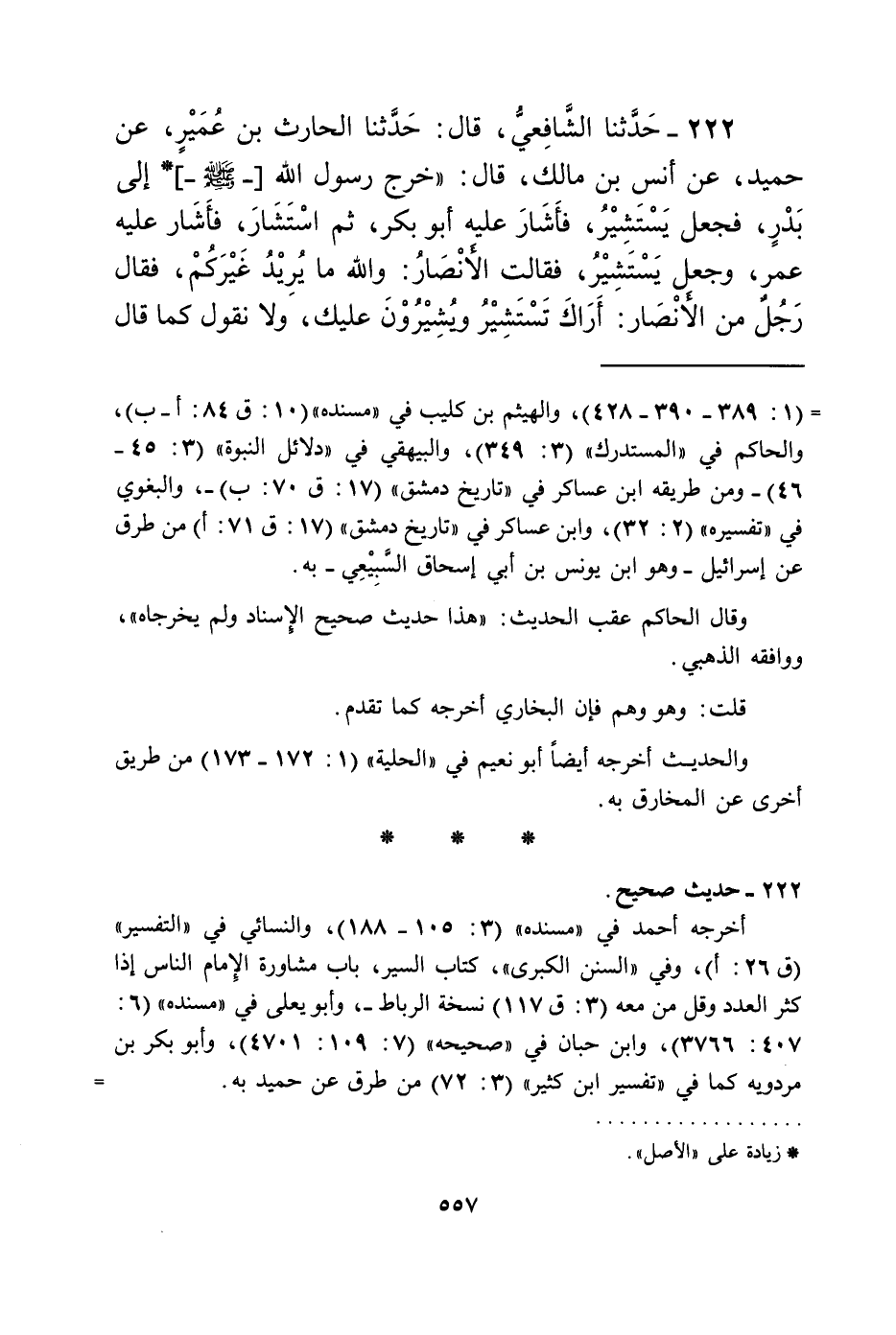 222 - حَدَّثَنَا الشَّافِعِيُّ، قَالَ: حَدَّثَنَا الْحَارِثُ بْنُ عُمَيْرٍ، عَنْ حُمَيْدٍ، عَنْ أَنَسِ بْنِ مَالِكٍ قَالَ: " خَرَجَ رَسُولُ اللَّهِ صَلَّى اللهُ عَلَيْهِ وَسَلَّمَ إِلَى بَدْرٍ، فَجَعَلَ يَسْتَشِيرُ، فَأَشَارَ عَلَيْهِ أَبُو بَكْرٍ، ثُمَّ اسْتَشَارَ فَأَشَارَ عَلَيْهِ عُمَرُ، وَجَعَلَ يَسْتَشِيرُ، فَقَالَ الْأَنْصَارُ: وَاللَّهِ مَا يُرِيدُ غَيْرَكُمْ، فَقَالَ رَجُلٌ مِنَ الْأَنْصَارِ: أَرَاكَ تَسْتَشِيرُ وَيُشِيرُونَ عَلَيْكَ، §وَلَا نَقُولُ كَمَا قَالَ بَنُو إِسْرَائِيلَ لِمُوسَى: {اذْهَبْ أَنْتَ وَرَبُّكَ فَقَاتِلَا إِنَّا هَاهُنَا قَاعِدُونَ} ، وَلَكِنْ وَالَّذِي بَعَثَكَ بِالْحَقِّ، لَوْ ضَرَبْتَ بِنَا أَكْبَادَهَا حَتَّى تَبْلُغَ بَرْكَ الْغِمَادِ لَكُنَّا مَعَكَ "