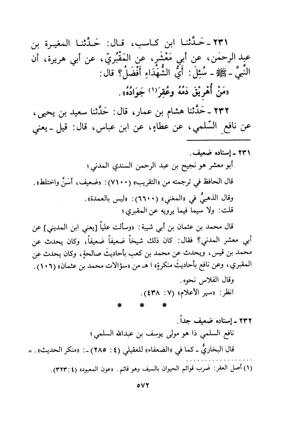 231 - حَدَّثَنَا ابْنُ كَاسِبٍ، قَالَ: حَدَّثَنَا الْمُغِيرَةُ بْنُ عَبْدِ الرَّحْمَنِ، عَنْ أَبِي مَعْشَرٍ، عَنِ الْمَقْبُرِيِّ، عَنْ أَبِي هُرَيْرَةَ، أَنَّ النَّبِيَّ صَلَّى اللهُ عَلَيْهِ وَسَلَّمَ سُئِلَ §أَيُّ الشُّهَدَاءِ أَفْضَلُ؟ قَالَ: «مَنْ أُهْرِيقَ دَمُهُ وَعُقِرَ جَوَادُهُ»