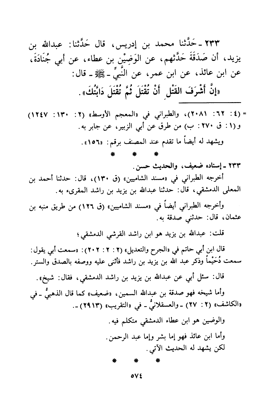 233 - حَدَّثَنَا مُحَمَّدُ بْنُ إِدْرِيسَ، قَالَ: حَدَّثَنَا عَبْدُ اللَّهِ بْنُ يَزِيدَ، أَنَّ صَدَقَةَ، حَدَّثَهُمْ عَنِ الْوَضِينِ بْنِ عَطَاءٍ، عَنْ أَبِي جُنَادَةَ، عَنِ ابْنِ عَائِذٍ، عَنِ ابْنِ عُمَرَ، عَنِ النَّبِيِّ صَلَّى اللهُ عَلَيْهِ وَسَلَّمَ قَالَ: «إِنَّ §أَشْرَفَ الْقَتْلِ أَنْ تُقْتَلَ ثُمَّ تُقْتَلَ دَابَّتُكَ»