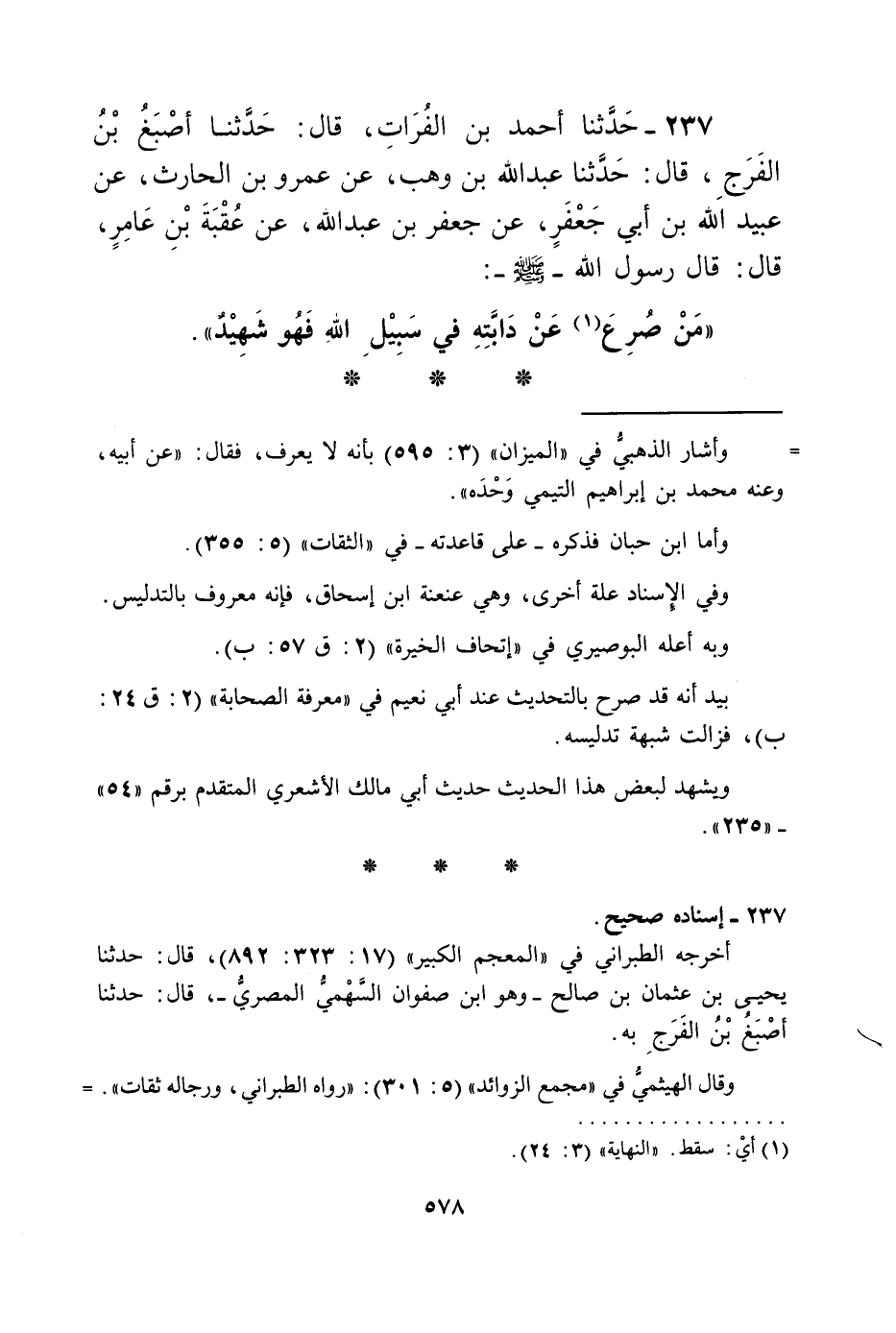 237 - حَدَّثَنَا أَحْمَدُ بْنُ الْفُرَاتِ، قَالَ: حَدَّثَنَا أَصْبَغُ بْنُ الْفَرَجِ، قَالَ: حَدَّثَنَا عَبْدُ اللَّهِ بْنُ وَهْبٍ، عَنْ عَمْرِو بْنِ الْحَارِثِ، عَنْ عُبَيْدِ اللَّهِ بْنِ أَبِي جَعْفَرٍ، عَنْ جَعْفَرِ بْنِ عَبْدِ اللَّهِ، عَنْ عُقْبَةَ بْنِ عَامِرٍ قَالَ: قَالَ رَسُولُ اللَّهِ صَلَّى اللهُ عَلَيْهِ وَسَلَّمَ: «§مَنْ صُرِعَ عَنْ دَابَّتِهِ فِي سَبِيلِ اللَّهِ فَهُوَ شَهِيدٌ»