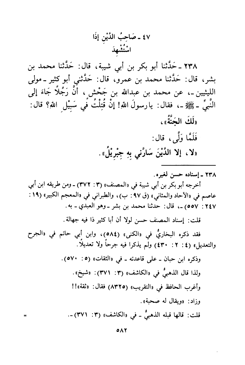 238 - حَدَّثَنَا أَبُو بَكْرِ بْنُ أَبِي شَيْبَةَ، قَالَ: حَدَّثَنَا مُحَمَّدُ بْنُ بِشْرٍ، قَالَ: حَدَّثَنَا مُحَمَّدُ بْنُ عَمْرٍو، قَالَ: حَدَّثَنِي أَبُو كَثِيرٍ، مَوْلَى اللَّيْثِيِّينَ، عَنْ مُحَمَّدِ بْنِ عَبْدِ اللَّهِ بْنِ جَحْشٍ أَنَّ رَجُلًا جَاءَ إِلَى النَّبِيِّ صَلَّى اللهُ عَلَيْهِ وَسَلَّمَ فَقَالَ: يَا رَسُولَ اللَّهِ، إِنْ قُتِلْتُ فِي سَبِيلِ اللَّهِ؟ قَالَ: «§لَكَ الْجَنَّةُ» ، فَلَمَّا وَلَّى، قَالَ: «لَا، إِلَّا الدَّيْنَ سَارَّنِي بِهِ جِبْرِيلُ»