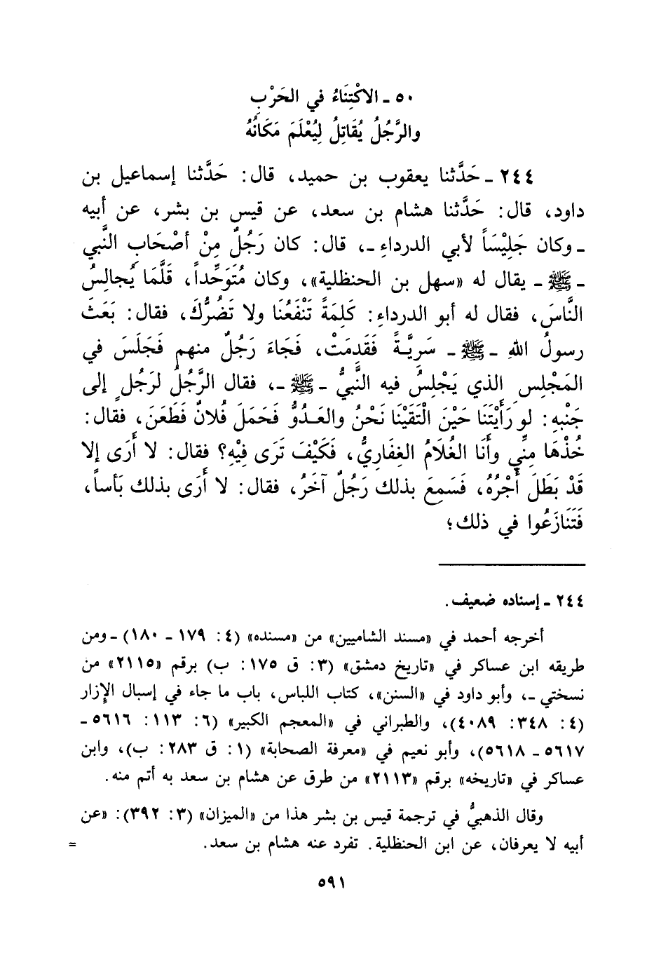 244 - حَدَّثَنَا يَعْقُوبُ بْنُ حُمَيْدٍ، قَالَ: حَدَّثَنَا إِسْمَاعِيلُ بْنُ دَاوُدَ، قَالَ: حَدَّثَنَا هِشَامُ بْنُ سَعْدٍ، عَنْ قَيْسِ بْنِ بِشْرٍ، عَنْ أَبِيهِ، وَكَانَ جَلِيسًا لِأَبِي الدَّرْدَاءِ قَالَ: كَانَ رَجُلٌ مِنْ أَصْحَابِ النَّبِيِّ صَلَّى اللهُ عَلَيْهِ وَسَلَّمَ يُقَالُ لَهُ سَهْلُ بْنُ الْحَنْظَلِيَّةِ وَكَانَ مُتَوَحِّدًا، قَلَّمَا يُجَالِسُ النَّاسَ، فَقَالَ لَهُ أَبُو الدَّرْدَاءِ: كَلِمَةً تَنْفَعُنَا وَلَا تَضُرُّكَ، فَقَالَ: بَعَثَ رَسُولُ اللَّهِ صَلَّى اللهُ عَلَيْهِ وَسَلَّمَ سَرِيَّةً فَقَدِمَتْ، فَجَاءَ رَجُلٌ مِنْهُمْ، فَجَلَسَ فِي الْمَجْلِسِ الَّذِي يَجْلِسُ فِيهِ النَّبِيُّ صَلَّى اللهُ عَلَيْهِ وَسَلَّمَ، فَقَالَ الرَّجُلُ لِرَجُلٍ إِلَى جَنْبِهِ: لَوْ رَأَيْتَنَا حِينَ الْتَقَيْنَا نَحْنُ وَالْعَدُوُّ، فَحَمَلَ فُلَانٌ فَطَعَنَ، فَقَالَ: خُذْهَا مِنًى وَأَنَا الْغُلَامُ الْغِفَارِيُّ، فَكَيْفَ تَرَى فِيهِ؟ فَقَالَ: لَا أَرَى إِلَّا قَدْ بَطَلَ أَجْرُهُ، فَسَمِعَ بِذَلِكَ رَجُلٌ آخَرَ فَقَالَ: لَا أَرَى بِذَلِكَ بَأْسًا، فَتَنَازَعُوا فِي ذَلِكَ -[592]-، فَسَمِعَ رَسُولُ اللَّهِ صَلَّى اللهُ عَلَيْهِ وَسَلَّمَ فَقَالَ: «§سُبْحَانَ اللَّهِ، لَا بَأْسَ أَنْ يُؤْجَرَ وَيُحْمَدَ» قَالَ: فَرَأَيْتُ أَبَا الدَّرْدَاءِ سُرَّ بِذَلِكَ وَفِيهِ عَنْ أَبِي عُقْبَةَ الْفَارِسِيِّ -[593]- فِي ذَلِكَ