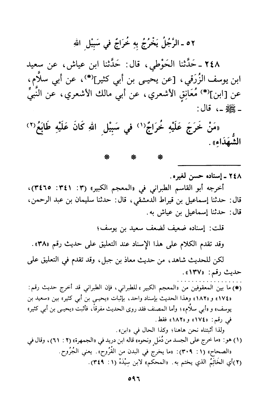248 - حَدَّثَنَا الْحَوْطِيُّ، قَالَ: حَدَّثَنَا ابْنُ عَيَّاشٍ، عَنْ سَعِيدِ بْنِ يُوسُفَ الزُّرَقِيِّ، عَنْ يَحْيَى بْنِ أَبِي كَثِيرٍ، عَنْ أَبِي سَلَّامٍ، عَنِ ابْنِ مُعَانِقٍ الْأَشْعَرِيِّ، عَنْ أَبِي مَالِكٍ الْأَشْعَرِيِّ، عَنِ النَّبِيِّ صَلَّى اللهُ عَلَيْهِ وَسَلَّمَ قَالَ: «§مَنْ خَرَجَ عَلَيْهِ خُرَاجٌ فِي سَبِيلِ اللَّهِ كَانَ عَلَيْهِ طَابَعُ الشُّهَدَاءِ»