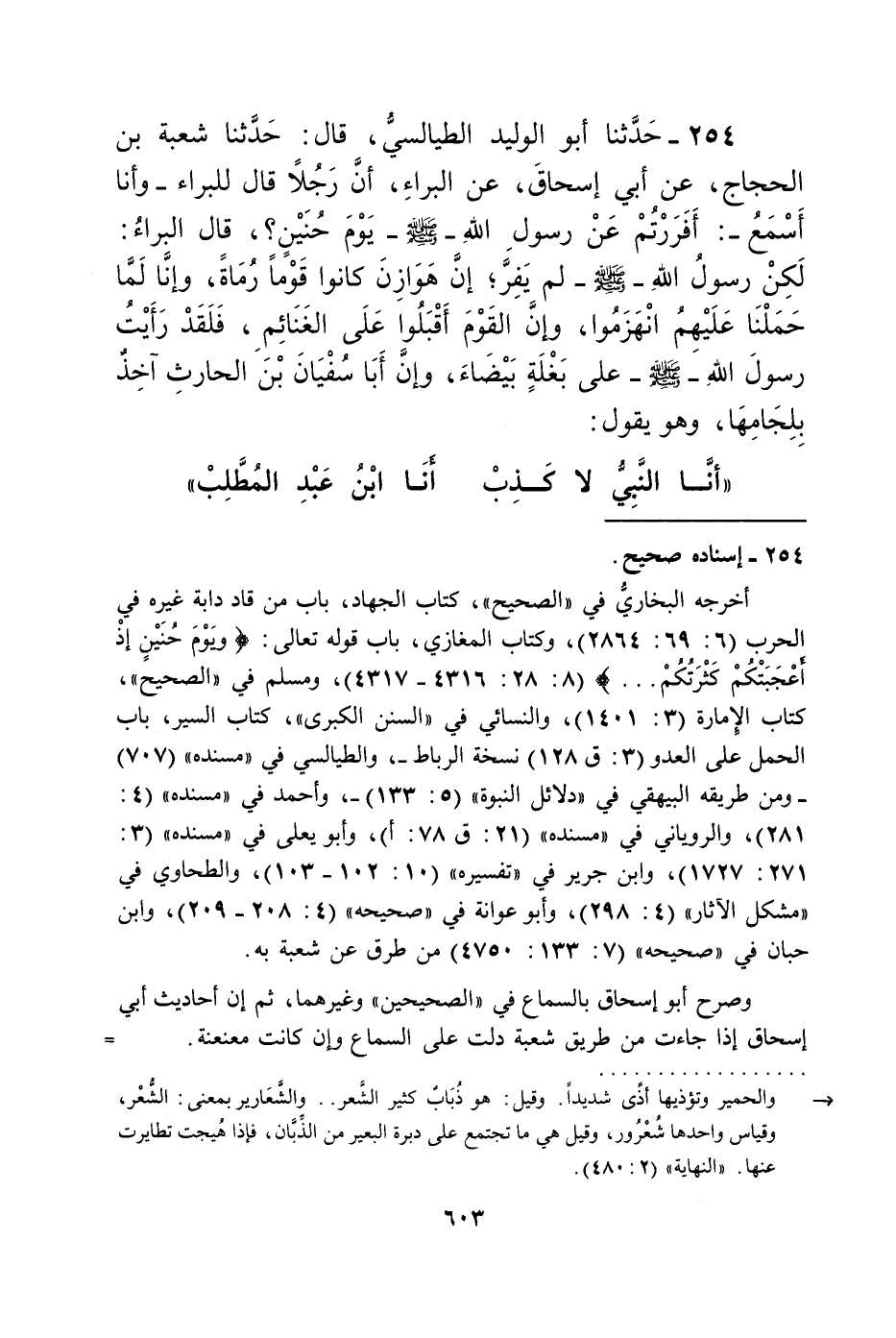 254 - حَدَّثَنَا أَبُو الْوَلِيدِ الطَّيَالِسِيُّ، قَالَ: حَدَّثَنَا شُعْبَةُ بْنُ الْحَجَّاجِ، عَنْ أَبِي إِسْحَاقَ، عَنِ الْبَرَاءِ، أَنَّ رَجُلًا قَالَ لِلْبَرَاءِ وَأَنَا أَسْمَعُ: أَفَرَرْتُمْ عَنْ رَسُولِ اللَّهِ صَلَّى اللهُ عَلَيْهِ وَسَلَّمَ يَوْمَ حُنَيْنٍ؟ قَالَ الْبَرَاءُ: لَكِنْ رَسُولُ اللَّهِ صَلَّى اللهُ عَلَيْهِ وَسَلَّمَ لَمْ يَفِرَّ، إِنَّ هَوَازِنَ كَانُوا قَوْمًا رُمَاةً، وَإِنَّا لَمَّا حَمَلْنَا عَلَيْهِمُ انْهَزَمُوا، وَإِنَّ الْقَوْمَ أَقْبَلُوا عَلَى الْغَنَائِمِ، فَلَقَدْ رَأَيْتُ رَسُولَ اللَّهِ صَلَّى اللهُ عَلَيْهِ وَسَلَّمَ عَلَى بَغْلَةٍ بَيْضَاءَ، وَإِنَّ أَبَا سُفْيَانَ بْنَ الْحَارِثِ آخِذٌ بِلِجَامِهَا وَهُوَ يَقُولُ: «§أَنَا النَّبِيُّ لَا كَذِبَ، أَنَا ابْنُ عَبْدِ الْمُطَّلِبِ»