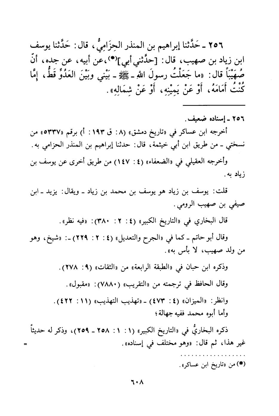 256 - حَدَّثَنَا إِبْرَاهِيمُ بْنُ الْمُنْذِرِ الْحِزَامِيُّ، قَالَ: حَدَّثَنَا يُوسُفُ ابْنُ زِيَادِ بْنِ صُهَيْبٍ، قَالَ: حَدَّثَنِي أَبِي، عَنْ أَبِيهِ، عَنْ جَدِّهِ، أَنَّ صُهَيْبًا، قَالَ: «§مَا جَعَلْتُ رَسُولَ اللَّهِ صَلَّى اللهُ عَلَيْهِ وَسَلَّمَ بَيْنِي وَبَيْنَ الْعَدُوِّ قَطُّ، إِمَّا كُنْتُ أَمَامَهُ، أَوْ عَنْ يَمِينِهِ، أَوْ عَنْ شِمَالِهِ»