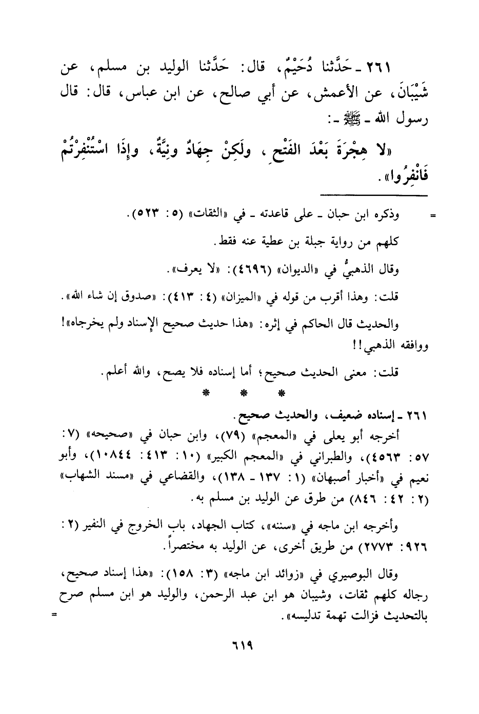 261 - حَدَّثَنَا دُحَيْمٌ، قَالَ: حَدَّثَنَا الْوَلِيدُ بْنُ مُسْلِمٍ، عَنْ شَيْبَانَ، عَنِ الْأَعْمَشِ، عَنْ أَبِي صَالِحٍ، عَنِ ابْنِ عَبَّاسٍ قَالَ: قَالَ رَسُولُ اللَّهِ صَلَّى اللهُ عَلَيْهِ وَسَلَّمَ: «§لَا هِجْرَةَ بَعْدَ الْفَتْحِ، وَلَكِنْ جِهَادٌ وَنِيَّةٌ، وَإِذَا اسْتُنْفِرْتُمْ فَانْفِرُوا»