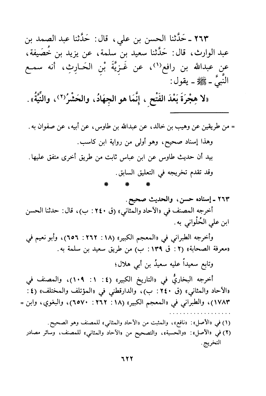 263 - حَدَّثَنَا الْحَسَنُ بْنُ عَلِيٍّ، قَالَ: حَدَّثَنَا عَبْدُ الصَّمَدِ بْنُ عَبْدِ الْوَارِثِ، قَالَ: حَدَّثَنَا سَعِيدُ بْنُ سَلَمَةَ، عَنْ يَزِيدَ بْنِ خُصَيْفَةَ، عَنْ عَبْدِ اللَّهِ بْنِ رَافِعٍ، عَنْ غَزِيَّةَ بْنِ الْحَارِثِ، أَنَّهُ سَمِعَ النَّبِيَّ صَلَّى اللهُ عَلَيْهِ وَسَلَّمَ يَقُولُ: «§لَا هِجْرَةَ بَعْدَ الْفَتْحِ، إِنَّمَا هُوَ الْجِهَادُ، وَالْحَشْرُ، وَالنِّيَّةُ»