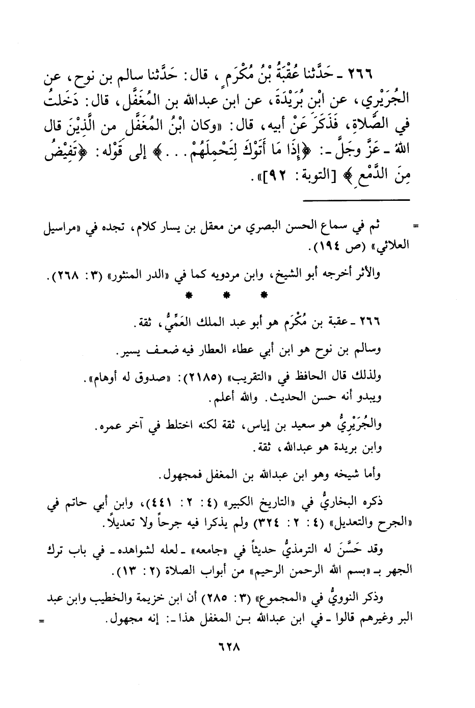 266 - حَدَّثَنَا عُقْبَةُ بْنُ مُكْرَمٍ، قَالَ: حَدَّثَنَا سَالِمُ بْنُ نُوحٍ، عَنِ الْجُرَيْرِيِّ، عَنِ ابْنِ بُرَيْدَةَ، عَنِ ابْنِ عَبْدِ اللَّهِ بْنِ الْمُغَفَّلِ، قَالَ: دَخَلْتُ فِي الصَّلَاةِ فَذَكَرَ عَنْ أَبِيهِ، قَالَ: " §وَكَانَ ابْنُ الْمُغَفَّلِ مِنَ الَّذِينَ قَالَ اللَّهُ عَزَّ وَجَلَّ: {إِذَا مَا أَتَوْكَ لِتَحْمِلَهُمْ} [التوبة: 92] إِلَى قَوْلِهِ: {تَفِيضُ مِنَ الدَّمْعِ} [التوبة: 92] "
