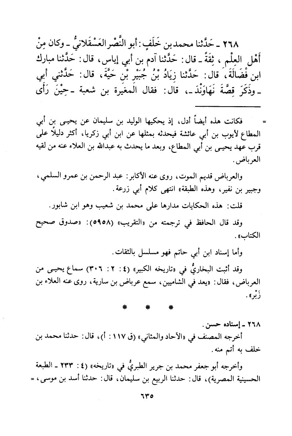 268 - حَدَّثَنَا مُحَمَّدُ بْنُ خَلَفٍ أَبُو النَّصْرِ الْعَسْقَلَانِيُّ، وَكَانَ مِنْ أَهْلِ الْعِلْمِ ثِقَةً قَالَ: حَدَّثَنَا آدَمُ بْنُ أَبِي إِيَاسٍ قَالَ: حَدَّثَنَا مُبَارَكُ بْنُ فَضَالَةَ قَالَ: حَدَّثَنَا زِيَادُ بْنُ جُبَيْرِ بْنِ حَيَّةَ قَالَ: حَدَّثَنِي أَبِي وَذَكَرَ قِصَّةَ نَهَاوَنْدَ قَالَ: فَقَالَ الْمُغِيرَةُ بْنُ شُعْبَةَ حِينَ رَأَى -[636]- كَثْرَتَهُمْ: «§لَمْ أَرَ كَالْيَوْمِ فَشَلًا إِنَّ عَدُوَّنَا يُتْرَكُونَ أَنْ يَنَامُوا فَلَا يُعْجَلُوا، أَمَا وَاللَّهِ لَوْ أَنَّ الْأَمْرَ إِلَيَّ لَأَعْجَلْتُهُمْ» قَالَ: وَكَانَ النُّعْمَانُ رَجُلًا بَكَّاءً، قَالَ: فَقَالَ لِلْمُغِيرَةِ بْنِ شُعْبَةَ: قَدْ كَانَ اللَّهُ يُشْهِدُكَ أَمْثَالَهَا، فَلَا يُخْزِيكَ وَلَا يُعْرِي مَوْقِفَكَ "