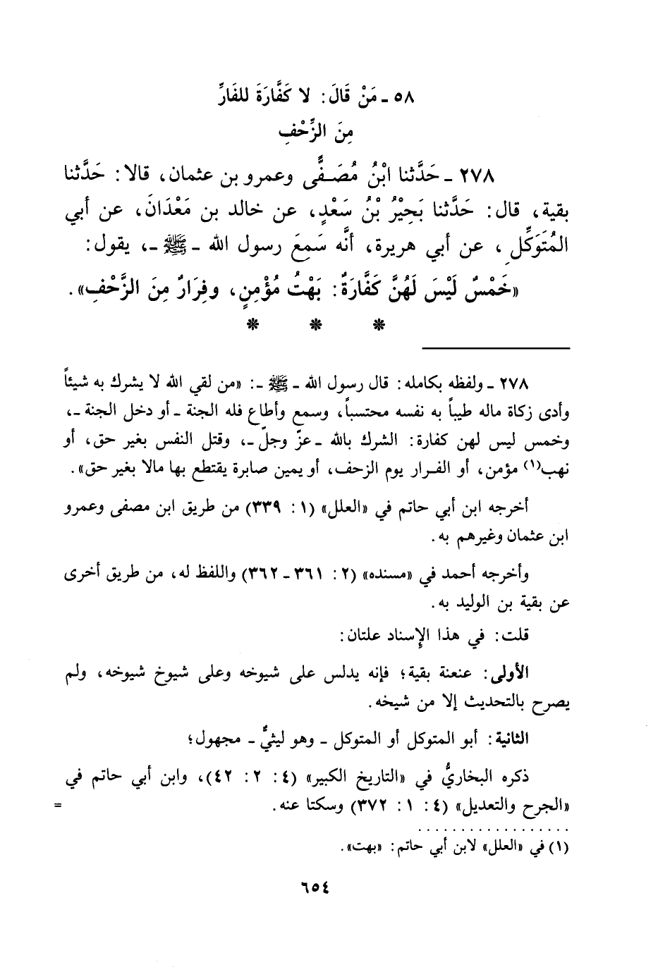 278 - حَدَّثَنَا ابْنُ مُصَفًّى، وَعَمْرُو بْنُ عُثْمَانَ، قَالَا: حَدَّثَنَا بَقِيَّةُ، قَالَ: حَدَّثَنَا بَحِيرُ بْنُ سَعْدٍ، عَنْ خَالِدِ بْنِ مَعْدَانَ، عَنْ أَبِي الْمُتَوَكِّلِ، عَنْ أَبِي هُرَيْرَةَ، أَنَّهُ سَمِعَ رَسُولَ اللَّهِ صَلَّى اللهُ عَلَيْهِ وَسَلَّمَ يَقُولُ: " §خَمْسٌ لَيْسَ لَهُنَّ كَفَّارَةٌ: بَهْتُ مُؤْمِنٍ، وَفِرَارٌ مِنَ الزَّحْفِ "