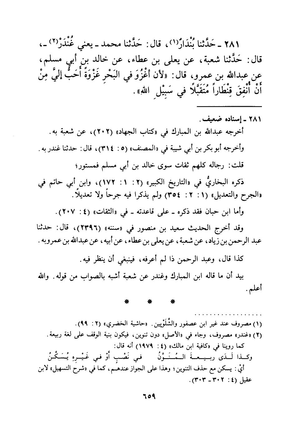 281 - حَدَّثَنَا بُنْدَارٌ، قَالَ: حَدَّثَنَا مُحَمَّدٌ يَعْنِي غُنْدَرْ، قَالَ: حَدَّثَنَا شُعْبَةُ، عَنْ يَعْلَى بْنِ عَطَاءٍ، عَنْ خَالِدِ بْنِ أَبِي مُسْلِمٍ، عَنْ عَبْدِ اللَّهِ بْنِ عَمْرٍو قَالَ: «§لَأَنْ أَغْزُوَ فِي الْبَحْرِ غَزْوَةً أَحَبُّ إِلَيَّ مِنْ أَنْ أُنْفِقَ قِنْطَارًا مُتَقَبَّلًا فِي سَبِيلِ اللَّهِ»