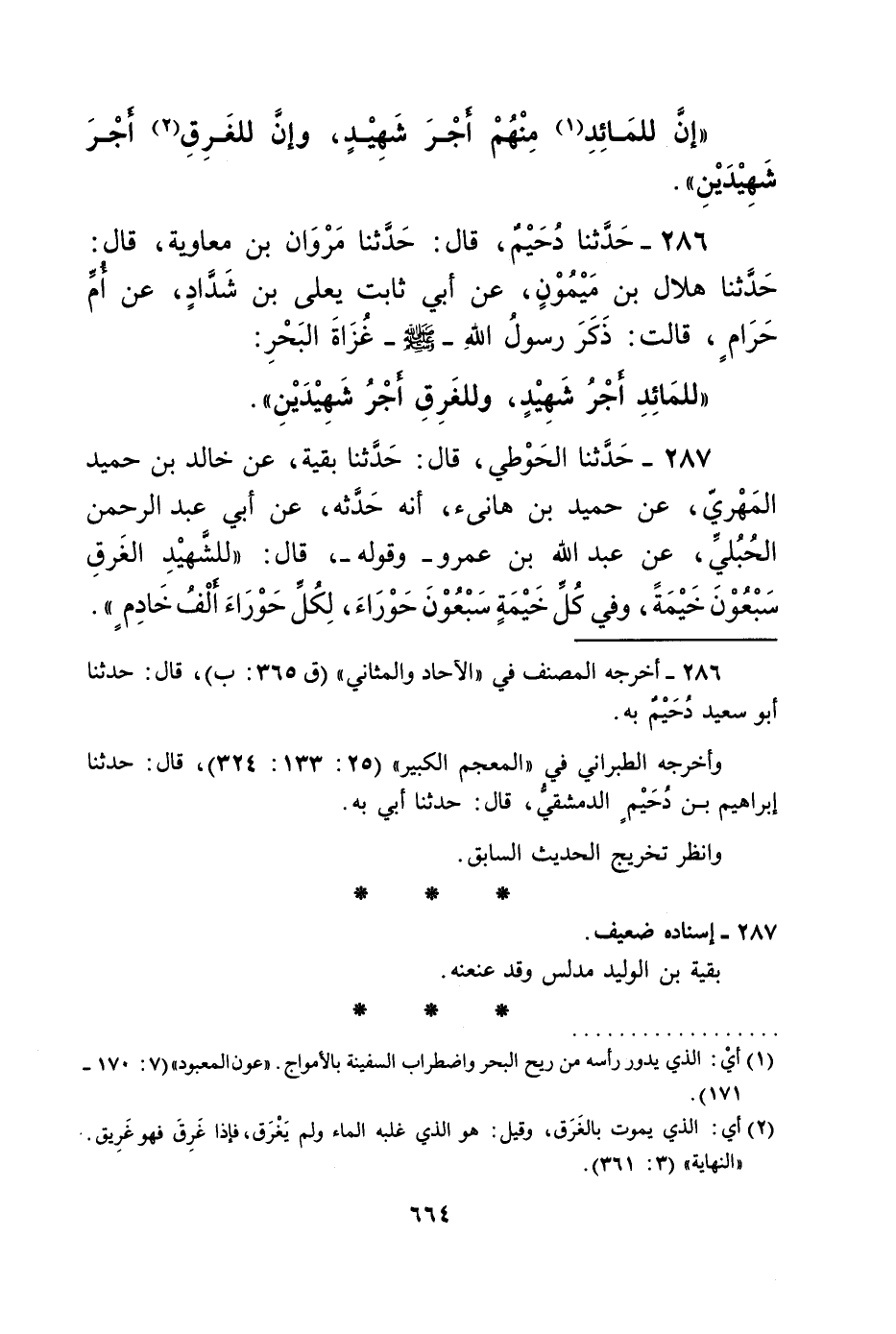 286 - حَدَّثَنَا دُحَيْمٌ، قَالَ: حَدَّثَنَا مَرْوَانُ بْنُ مُعَاوِيَةَ، قَالَ: حَدَّثَنَا هِلَالُ بْنُ مَيْمُونٍ، عَنْ أَبِي ثَابِتٍ يَعْلَى بْنِ شَدَّادٍ، عَنْ أُمِّ حَرَامٍ، قَالَتْ: ذَكَرَ رَسُولُ اللَّهِ صَلَّى اللهُ عَلَيْهِ وَسَلَّمَ غُزَاةَ الْبَحْرِ: «§لِلْمَائِدِ أَجْرُ شَهِيدٍ، وَلِلْغَرِقِ أَجْرُ شَهِيدَيْنِ»
