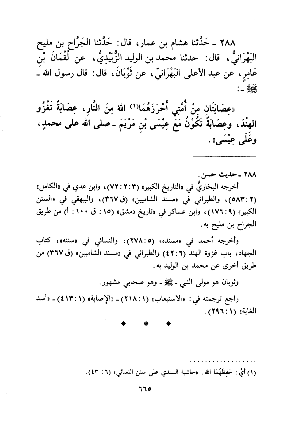 288 - حَدَّثَنَا هِشَامُ بْنُ عَمَّارٍ، قَالَ: حَدَّثَنَا الْجَرَّاحُ بْنُ مَلِيحٍ الْبَهْرَانِيُّ، قَالَ: حَدَّثَنَا مُحَمَّدُ بْنُ الْوَلِيدِ الزُّبَيْدِيُّ، عَنْ لُقْمَانَ بْنِ عَامِرٍ، عَنْ عَبْدِ الْأَعْلَى الْبَهْرَانِيِّ، عَنْ ثَوْبَانَ قَالَ: قَالَ رَسُولُ اللَّهِ صَلَّى اللهُ عَلَيْهِ وَسَلَّمَ: «§عِصَابَتَانِ مِنْ أُمَّتِي أَحْرَزَهُمَا اللَّهُ مِنَ النَّارِ، عِصَابَةٌ تَغْزُو الْهِنْدَ، وَعِصَابَةٌ تَكُونُ مَعَ عِيسَى ابْنِ مَرْيَمَ صَلَّى اللَّهُ عَلَى مُحَمَّدٍ وَعَلَى عِيسَى»