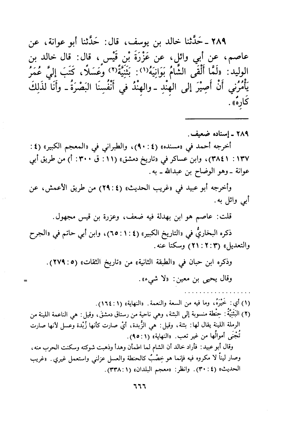 289 - حَدَّثَنَا خَالِدُ بْنُ يُوسُفَ، قَالَ: حَدَّثَنَا أَبُو عَوَانَةَ: عَنْ عَاصِمٍ، عَنْ أَبِي وَائِلٍ، عَنْ عَزْرَةَ بْنِ قَيْسٍ، قَالَ: قَالَ خَالِدُ بْنُ الْوَلِيدِ: " §لَمَّا أَلْقَى الشَّامُ بَوَانِيَهُ بَثَنِيَّةً وَعَسَلًا كَتَبَ إِلَيَّ عُمَرُ يَأْمُرُنِي: أَنْ أَصِيرَ إِلَى الْهِنْدِ - وَالْهِنْدُ فِي أَنْفُسِنَا الْبَصْرَةُ - وَأَنَا لِذَلِكَ كَارِهٌ "