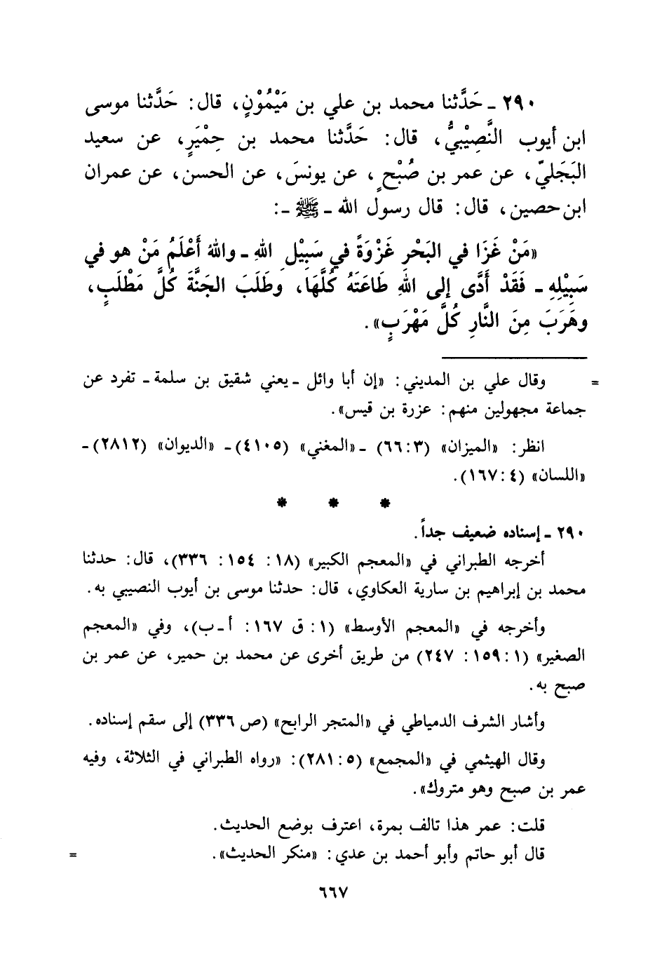 290 - حَدَّثَنَا مُحَمَّدُ بْنُ عَلِيِّ بْنِ مَيْمُونٍ، قَالَ: حَدَّثَنَا مُوسَى بْنُ أَيُّوبَ النَّصِيبِيُّ، قَالَ: حَدَّثَنَا مُحَمَّدُ بْنُ حِمْيَرٍ، عَنْ سَعِيدٍ الْبَجَلِيِّ، عَنْ عُمَرَ بْنِ صُبْحٍ، عَنْ يُونُسَ، عَنِ الْحَسَنِ، عَنْ عِمْرَانَ بْنِ حُصَيْنٍ قَالَ: قَالَ رَسُولُ اللَّهِ صَلَّى اللهُ عَلَيْهِ وَسَلَّمَ: «§مَنْ غَزَا فِي الْبَحْرِ غَزْوَةً فِي سَبِيلِ اللَّهِ - وَاللَّهُ أَعْلَمُ مَنْ هُوَ فِي سَبِيلِهِ - فَقَدْ أَدَّى إِلَى اللَّهِ طَاعَتَهُ كُلَّهَا، وَطَلَبَ الْجَنَّةَ كُلَّ مَطْلَبٍ، وَهَرَبَ مِنَ النَّارِ كُلَّ مَهْرَبٍ»