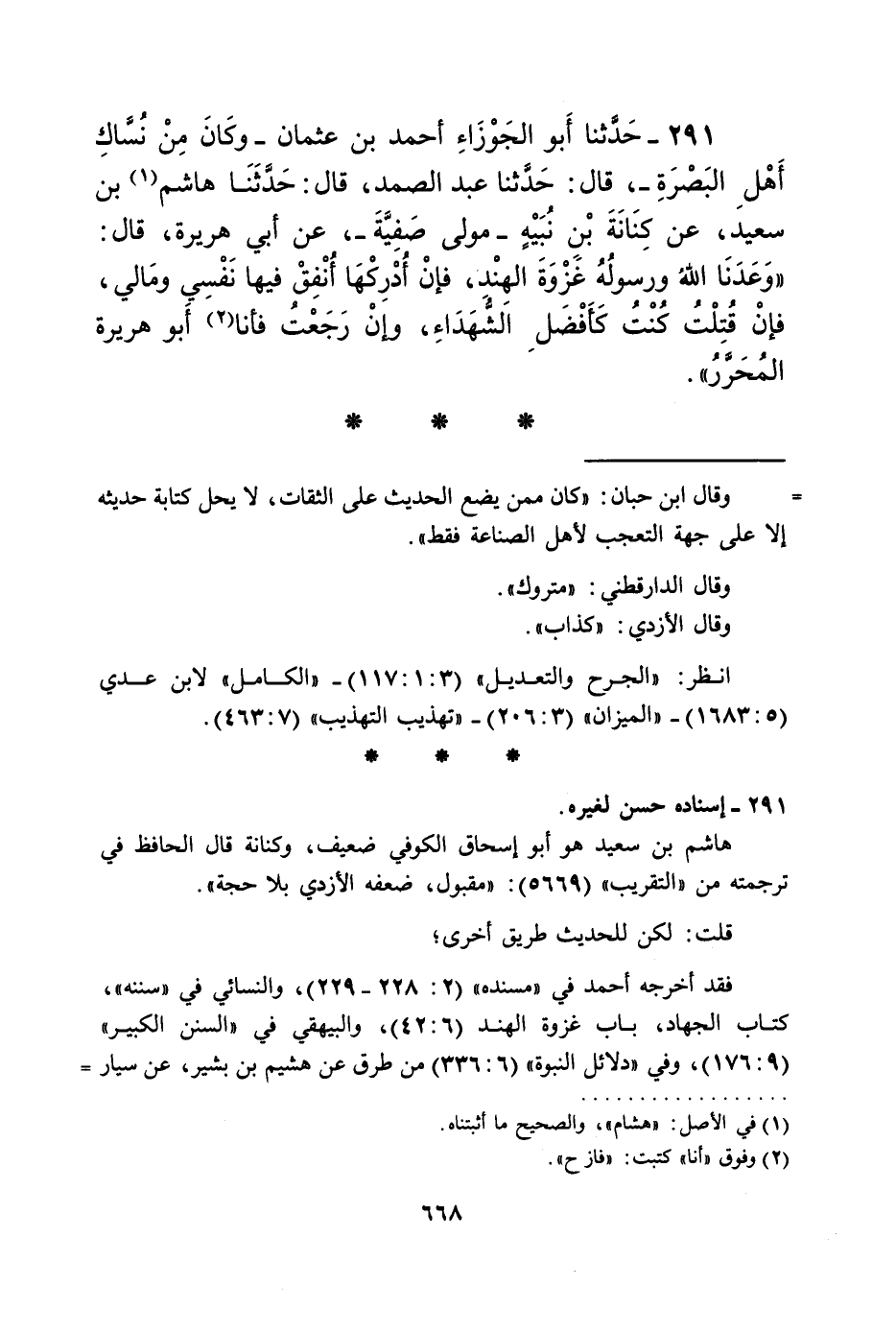 291 - حَدَّثَنَا أَبُو الْجَوْزَاءِ أَحْمَدُ بْنُ عُثْمَانَ - وَكَانَ مِنْ نُسَّاكِ أَهْلِ الْبَصْرَةِ - قَالَ: حَدَّثَنَا عَبْدُ الصَّمَدِ قَالَ: حَدَّثَنَا هَاشِمُ بْنُ سَعِيدٍ، عَنْ كِنَانَةَ بْنِ نُبَيْهٍ مَوْلَى صَفِيَّةَ، عَنْ أَبِي هُرَيْرَةَ قَالَ: «§وَعَدَنَا اللَّهُ وَرَسُولُهُ غَزْوَةَ الْهِنْدِ، فَإِنْ أُدْرِكْهَا أُنْفِقْ فِيهَا نَفْسِي وَمَالِي، فَإِنْ قُتِلْتُ كُنْتُ كَأَفْضَلِ الشُّهَدَاءِ، وَإِنْ رَجَعْتُ فَأَنَا أَبُو هُرَيْرَةَ الْمُحَرَّرُ»