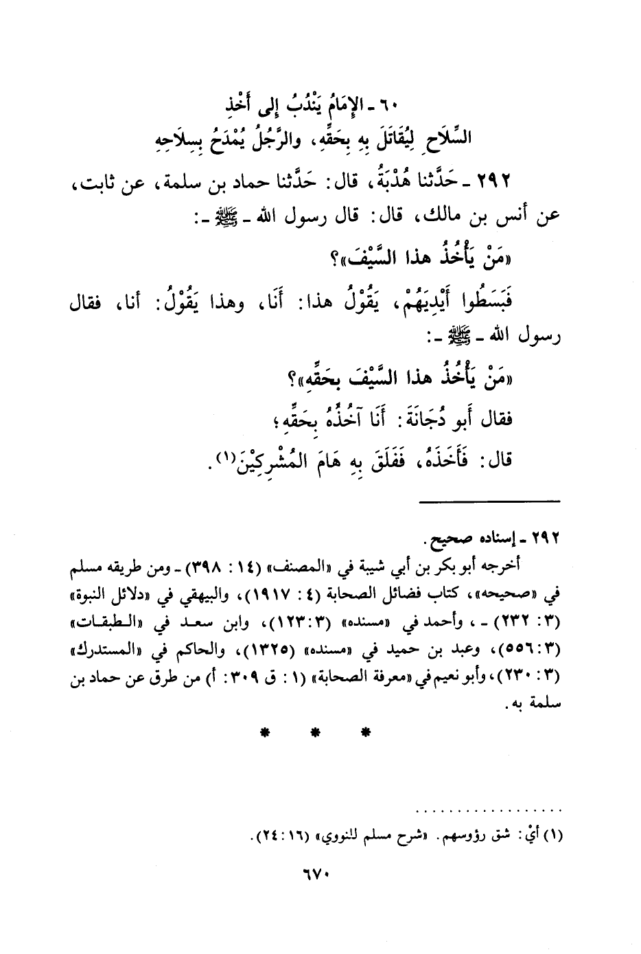 292 - حَدَّثَنَا هُدْبَةُ، قَالَ: حَدَّثَنَا حَمَّادُ بْنُ سَلَمَةَ، عَنْ ثَابِتٍ، عَنْ أَنَسِ بْنِ مَالِكٍ قَالَ: قَالَ رَسُولُ اللَّهِ صَلَّى اللهُ عَلَيْهِ وَسَلَّمَ: «مَنْ يَأْخُذُ هَذَا السَّيْفَ؟» فَبَسَطُوا أَيْدِيَهُمْ، يَقُولُ هَذَا: أَنَا، وَهَذَا يَقُولُ: أَنَا، فَقَالَ رَسُولُ اللَّهِ صَلَّى اللهُ عَلَيْهِ وَسَلَّمَ: «§مَنْ يَأْخُذُ هَذَا السَّيْفَ بِحَقِّهِ؟» فَقَالَ أَبُو دُجَانَةَ: أَنَا آخُذُهُ بِحَقِّهِ، قَالَ: فَأَخَذَهُ فَفَلَقَ بِهِ هَامَ الْمُشْرِكِينَ