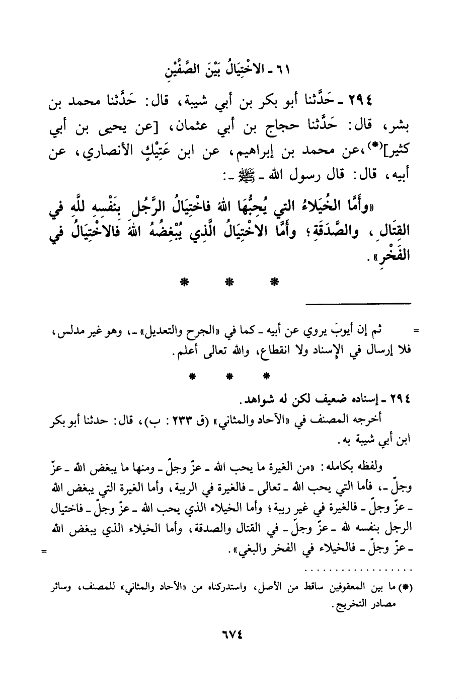 حَدَّثَنَا أَبُو بَكْرِ بْنُ أَبِي شَيْبَةَ، قَالَ: حَدَّثَنَا مُحَمَّدُ بْنُ بِشْرٍ، قَالَ: حَدَّثَنَا حَجَّاجُ بْنُ أَبِي عُثْمَانَ، عَنْ يَحْيَى بْنِ أَبِي كَثِيرٍ، عَنْ مُحَمَّدِ بْنِ إِبْرَاهِيمَ، عَنِ ابْنِ عَتِيكٍ الْأَنْصَارِيِّ، عَنْ أَبِيهِ، قَالَ: قَالَ رَسُولُ اللَّهِ صَلَّى اللهُ عَلَيْهِ وَسَلَّمَ: «§وَأَمَّا الْخُيَلَاءُ الَّتِي يُحِبُّهَا اللَّهُ فَاخْتِيَالُ الرَّجُلِ بِنَفْسِهِ لِلَّهِ فِي الْقِتَالِ، وَالصَّدَقَةِ، وَأَمَّا الِاخْتِيَالُ الَّذِي يُبْغِضُهُ اللَّهُ فَالِاخْتِيَالُ فِي الْفَخْرِ»