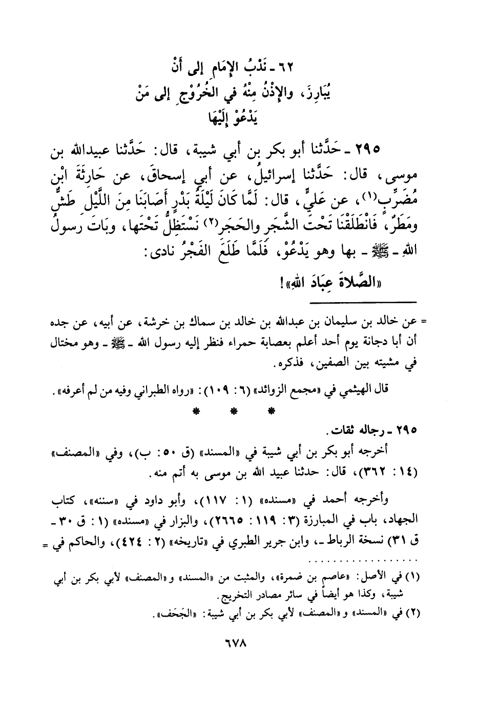 295 - حَدَّثَنَا أَبُو بَكْرِ بْنُ أَبِي شَيْبَةَ، قَالَ: حَدَّثَنَا عُبَيْدُ اللَّهِ بْنُ مُوسَى، قَالَ: حَدَّثَنَا إِسْرَائِيلُ، عَنْ أَبِي إِسْحَاقَ، عَنْ حَارِثَةَ بْنِ مُضَرِّبٍ، عَنْ عَلِيٍّ قَالَ: لَمَّا كَانَ لَيْلَةُ بَدْرٍ أَصَابَنَا مِنَ اللَّيْلِ طَشٌّ وَمَطَرٌ، فَانْطَلَقْنَا تَحْتَ الشَّجَرِ وَالْحَجَرِ نَسْتَظِلُّ تَحْتَهَا، وَبَاتَ رَسُولُ اللَّهِ صَلَّى اللهُ عَلَيْهِ وَسَلَّمَ بِهَا وَهُوَ يَدْعُو، فَلَمَّا طَلَعَ الْفَجْرُ نَادَى: «§الصَّلَاةَ عِبَادَ اللَّهِ» -[679]- فَجَاءَ النَّاسُ، فَصَلَّى بِنَا رَسُولُ اللَّهِ صَلَّى اللهُ عَلَيْهِ وَسَلَّمَ، وَحَضَّ عَلَى الْقِتَالِ، قَالَ: فَبَرَزَ عُتْبَةُ وَأَخُوهُ شَيْبَةُ وَابْنُهُ الْوَلِيدُ حَمِيَّةً فَقَالُوا: مَنْ يُبَارِزُ؟ فَخَرَجَ فِتْيَةٌ مِنَ الْأَنْصَارِ سِتَّةٌ، فَقَالَ عُتْبَةُ: لَا نُرِيدُ هَؤُلَاءِ، وَلَكِنْ يُبَارِزُنَا مِنْ بَنِي عَمِّنَا مِنْ بَنِي عَبْدِ الْمُطَّلِبِ فَقَالَ رَسُولُ اللَّهِ صَلَّى اللهُ عَلَيْهِ وَسَلَّمَ: «قُمْ يَا عَلِيُّ، قُمْ يَا حَمْزَةُ، قُمْ يَا عُبَيْدَةُ بْنَ الْحَارِثِ» فَقَتَلَ اللَّهُ عُتْبَةَ بْنَ رَبِيعَةَ، وَشَيْبَةَ بْنَ رَبِيعَةَ، وَالْوَلِيدَ بْنَ عُتْبَةَ