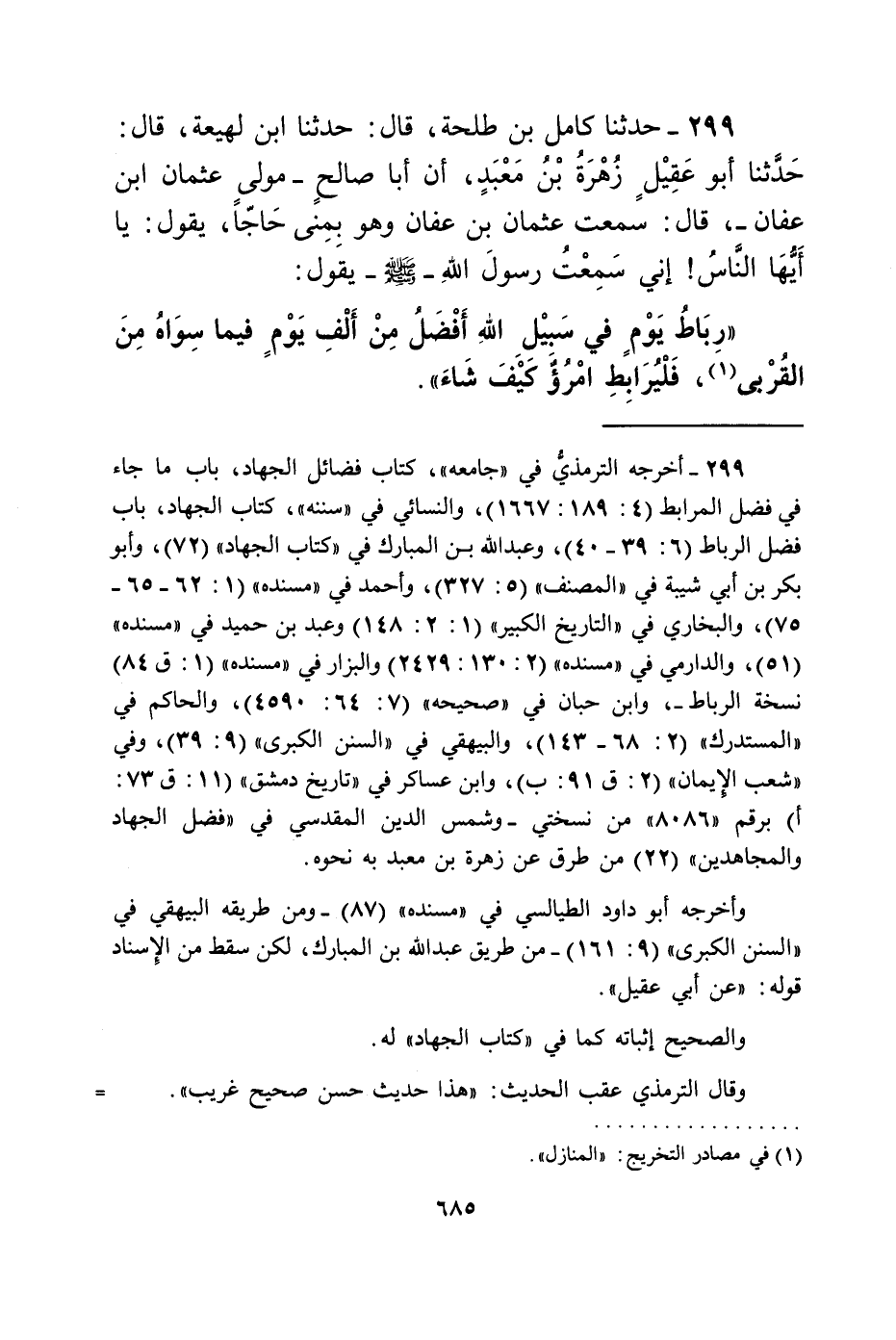 299 - حَدَّثَنَا كَامِلُ بْنُ طَلْحَةَ، قَالَ: حَدَّثَنَا ابْنُ لَهِيعَةَ، قَالَ: حَدَّثَنَا أَبُو عَقِيلٍ زُهْرَةُ بْنُ مَعْبَدٍ أَنَّ أَبَا صَالِحٍ، مَوْلَى عُثْمَانَ بْنِ عَفَّانَ قَالَ: سَمِعْتُ عُثْمَانَ بْنَ عَفَّانَ، وَهُوَ بِمِنًى حَاجًّا يَقُولُ: يَا أَيُّهَا النَّاسُ، إِنِّي سَمِعْتُ رَسُولَ اللَّهِ صَلَّى اللهُ عَلَيْهِ وَسَلَّمَ يَقُولُ: «§رِبَاطُ يَوْمٍ فِي سَبِيلِ اللَّهِ أَفْضَلُ مِنْ أَلْفِ يَوْمٍ فِيمَا سِوَاهُ مِنَ الْقُرْبَى، فَلْيُرَابِطِ امْرُؤٌ كَيْفَ شَاءَ»
