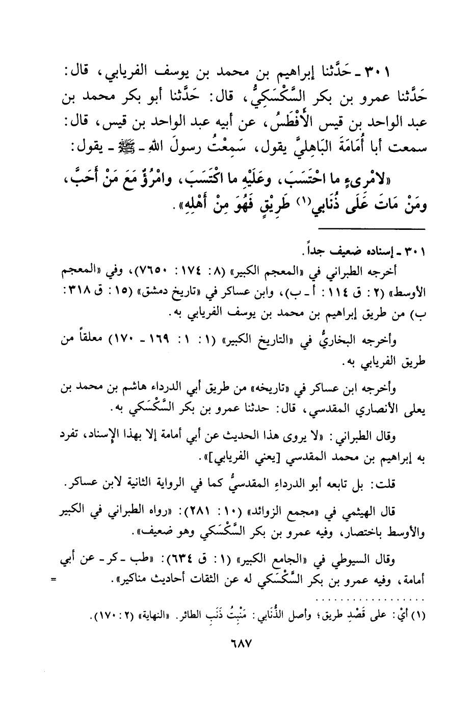 301 - حَدَّثَنَا إِبْرَاهِيمُ بْنُ مُحَمَّدِ بْنِ يُوسُفَ الْفِرْيَابِيُّ، قَالَ: حَدَّثَنَا عَمْرُو بْنُ بَكْرٍ السَّكْسَكِيُّ، قَالَ: حَدَّثَنَا أَبُو بَكْرٍ مُحَمَّدُ بْنُ عَبْدِ الْوَاحِدِ بْنِ قَيْسٍ الْأَفْطَسُ، عَنْ أَبِيهِ عَبْدِ الْوَاحِدِ بْنِ قَيْسٍ، قَالَ: سَمِعْتُ أَبَا أُمَامَةَ الْبَاهِلِيَّ يَقُولُ: سَمِعْتُ رَسُولَ اللَّهِ صَلَّى اللهُ عَلَيْهِ وَسَلَّمَ يَقُولُ: «§لِامْرِئٍ مَا احْتَسَبَ، وَعَلَيْهِ مَا اكْتَسَبَ، وَامْرُؤٌ مَعَ مَنْ أَحَبَّ، وَمَنْ مَاتَ عَلَى ذُنَابَى طَرِيقٍ فَهُوَ مِنْ أَهْلِهِ»