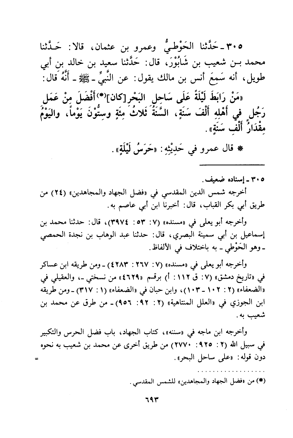 305 - حَدَّثَنَا الْحَوْطِيُّ، وَعَمْرُو بْنُ عُثْمَانَ، قَالَا: حَدَّثَنَا مُحَمَّدُ بْنُ شُعَيْبِ بْنِ شَابُورَ، قَالَ: حَدَّثَنَا سَعِيدُ بْنُ خَالِدِ بْنِ أَبِي طَوِيلٍ، أَنَّهُ سَمِعَ أَنَسَ بْنَ مَالِكٍ يَقُولُ: عَنِ النَّبِيِّ صَلَّى اللهُ عَلَيْهِ وَسَلَّمَ أَنَّهُ قَالَ: «§مَنْ رَابَطَ لَيْلَةً عَلَى سَاحِلِ الْبَحْرِ كَانَ أَفْضَلَ مِنْ عَمَلِ رَجُلٍ فِي أَهْلِهِ أَلْفَ سَنَةٍ، السَّنَةُ ثَلَاثُ مِائَةٍ وَسِتُّونَ يَوْمًا، وَالْيَوْمُ مِقْدَارُ أَلْفِ سَنَةٍ» ، قَالَ عَمْرٌو فِي حَدِيثِهِ: «حَرَسُ لَيْلَةٍ»