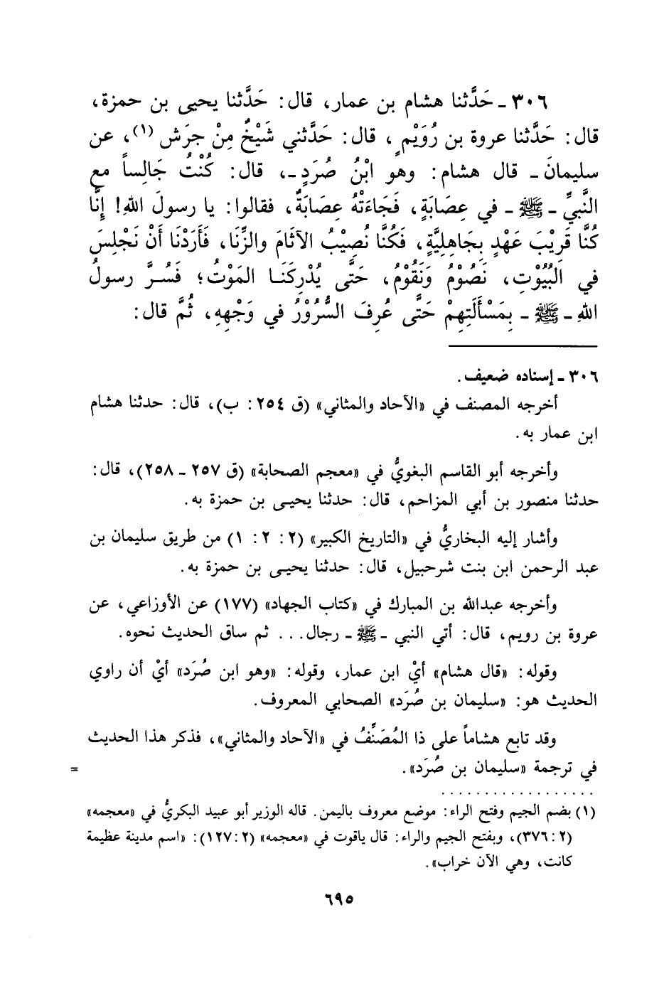 306 - حَدَّثَنَا هِشَامُ بْنُ عَمَّارٍ، قَالَ: حَدَّثَنَا يَحْيَى بْنُ حَمْزَةَ، قَالَ: حَدَّثَنَا عُرْوَةُ بْنُ رُوَيْمٍ، قَالَ: حَدَّثَنِي شَيْخٌ، مِنْ جُرَشَ، عَنْ سُلَيْمَانَ - قَالَ هِشَامٌ: وَهُوَ ابْنُ صُرَدَ - قَالَ: كُنْتُ جَالِسًا مَعَ النَّبِيِّ صَلَّى اللهُ عَلَيْهِ وَسَلَّمَ فِي عِصَابَةٍ، فَجَاءَتْهُ عِصَابَةٌ فَقَالُوا: يَا رَسُولَ اللَّهِ، إِنَّا كُنَّا قَرِيبَ عَهْدٍ بِجَاهِلِيَّةٍ، فَكُنَّا نُصِيبُ الْآثَامَ وَالزِّنَا، فَأَرَدْنَا أَنْ نَجْلِسَ فِي الْبُيُوتِ نَصُومُ وَنَقُومُ حَتَّى يُدْرِكَنَا الْمَوْتُ، فَسُّرَ رَسُولُ اللَّهِ صَلَّى اللهُ عَلَيْهِ وَسَلَّمَ بِمَسْأَلَتِهِمْ حَتَّى عُرِفَ السُّرُورُ فِي وَجْهِهِ، ثُمَّ قَالَ -[696]-: «§إِنَّكُمْ سَتُجَنَّدُونَ أَجْنَادًا، وَيَكُونُ لَكُمْ ذِمَّةٌ وَخَرَاجٌ، فَيَفْتَحُ اللَّهُ لَكُمْ مِنْهَا مَا يَكُونُ عَلَى سَيْفِ بَحْرٍ مَدَائِنَ وَقُصُورًا، فَمَنْ أَدْرَكَ ذَلِكَ مِنْكُمْ، وَاسْتَطَاعَ أَنْ يَحْبِسَ نَفْسَهُ فِي مَدِينَةٍ مِنْ تِلْكَ الْمَدَائِنِ، أَوْ قَصْرٍ مِنْ تِلْكَ الْقُصُورِ، فَلْيَفْعَلْ حَتَّى يُدْرِكَهُ الْمَوْتُ»