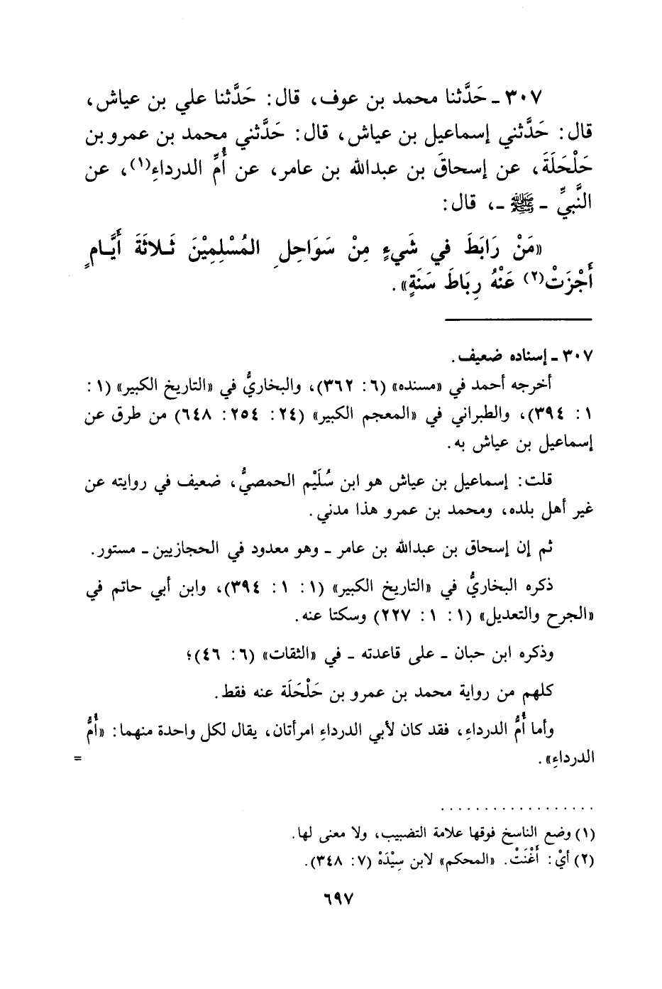 307 - حَدَّثَنَا مُحَمَّدُ بْنُ عَوْفٍ، قَالَ: حَدَّثَنَا عَلِيُّ بْنُ عَيَّاشٍ، قَالَ: حَدَّثَنِي إِسْمَاعِيلُ بْنُ عَيَّاشٍ، قَالَ: حَدَّثَنِي مُحَمَّدُ بْنُ عَمْرِو بْنِ حَلْحَلَةَ، عَنْ إِسْحَاقَ بْنِ عَبْدِ اللَّهِ بْنِ عَامِرٍ، عَنْ أُمِّ الدَّرْدَاءِ، عَنِ النَّبِيِّ صَلَّى اللهُ عَلَيْهِ وَسَلَّمَ قَالَ: «§مَنْ رَابَطَ فِي شَيْءٍ مِنْ سَوَاحِلِ الْمُسْلِمِينَ ثَلَاثَةَ أَيَّامٍ أَجْزَتْ عَنْهُ رِبَاطَ سَنَةٍ»