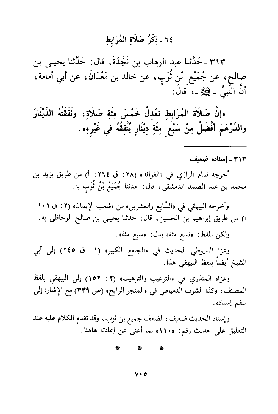 313 - حَدَّثَنَا عَبْدُ الْوَهَّابِ بْنُ نَجْدَةَ، قَالَ: حَدَّثَنَا يَحْيَى بْنُ صَالِحٍ، عَنْ جُمَيْعِ بْنِ ثُوَبٍ، عَنْ خَالِدِ بْنِ مَعْدَانَ، عَنْ أَبِي أُمَامَةَ، أَنَّ النَّبِيَّ صَلَّى اللهُ عَلَيْهِ وَسَلَّمَ قَالَ: «إِنَّ §صَلَاةَ الْمُرَابِطِ تَعْدِلُ خَمْسَ مِائَةِ صَلَاةٍ، وَنَفَقَتُهُ الدِّينَارَ وَالدِّرْهَمَ أَفْضَلُ مِنْ سَبْعِ مِائَةِ دِينَارٍ يُنْفِقُهُ فِي غَيْرِهِ»