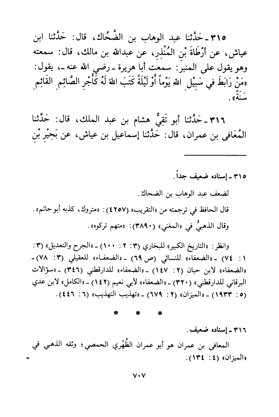 315 - حَدَّثَنَا عَبْدُ الْوَهَّابِ بْنُ الضَّحَّاكِ، قَالَ: حَدَّثَنَا ابْنُ عَيَّاشٍ، عَنْ أَرْطَاةَ بْنِ الْمُنْذِرِ، عَنْ عَبْدِ اللَّهِ بْنِ مَالِكٍ، قَالَ: سَمِعْتُهُ وَهُوَ يَقُولُ عَلَى الْمِنْبَرِ: سَمِعْتُ أَبَا هُرَيْرَةَ رِضِيَ اللَّهُ عَنْهُ يَقُولُ: «§مَنْ رَابَطَ فِي سَبِيلِ اللَّهِ يَوْمًا , أَوْ لَيْلَةً , كَتَبَ اللَّهُ لَهُ كَأَجْرِ الصَّائِمِ الْقَائِمِ سَنَةً»