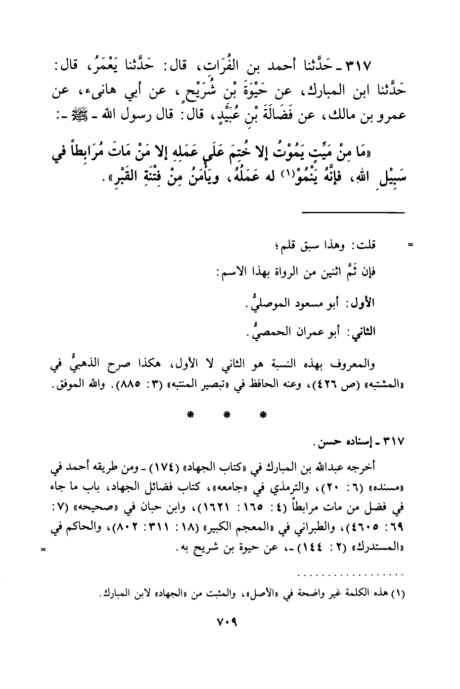 317 - حَدَّثَنَا أَحْمَدُ بْنُ الْفُرَاتِ، قَالَ: حَدَّثَنَا يَعْمَرُ، قَالَ: حَدَّثَنَا ابْنُ الْمُبَارَكِ، عَنْ حَيْوَةَ بْنِ شُرَيْحٍ، عَنْ أَبِي هَانِئٍ، عَنْ عَمْرِو بْنِ مَالِكٍ، عَنْ فَضَالَةَ بْنِ عُبَيْدٍ قَالَ: قَالَ رَسُولُ اللَّهِ صَلَّى اللهُ عَلَيْهِ وَسَلَّمَ: «§مَا مِنْ مَيِّتٍ يَمُوتُ إِلَّا خُتِمَ عَلَى عَمَلِهِ , إِلَّا مَنْ مَاتَ مُرَابِطًا فِي سَبِيلِ اللَّهِ، فَإِنَّهُ يَنْمُو لَهُ عَمَلُهُ، وَيَأْمَنُ مِنْ فِتْنَةِ الْقَبْرِ»